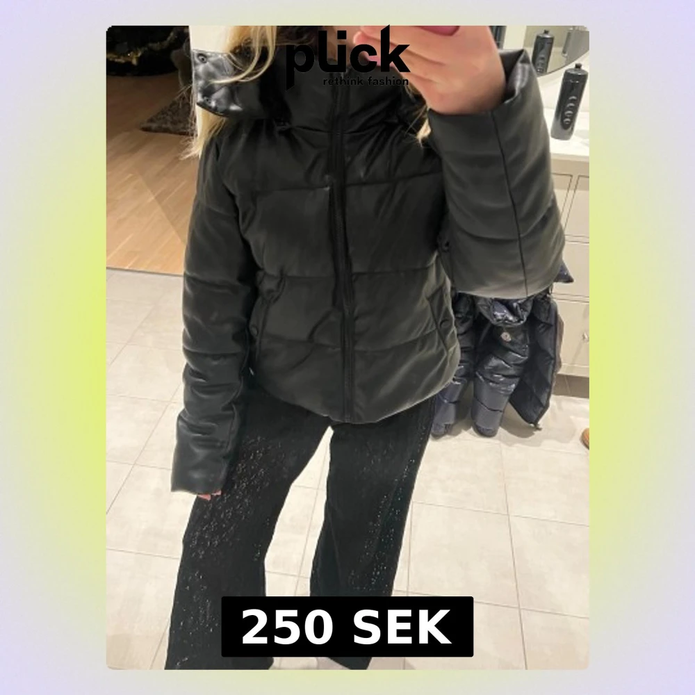 Säljer en svart pufferjacka i skinnimitation med dragkedja framtill och luva. Jackan har en oversized känsla och är perfekt för kyliga dagar. Den har långa ärmar och en stilren look som passar till många outfits. Den är superskön och håller än varm på vintern, knappt använd bara testad. Pris kan diskuteras💕