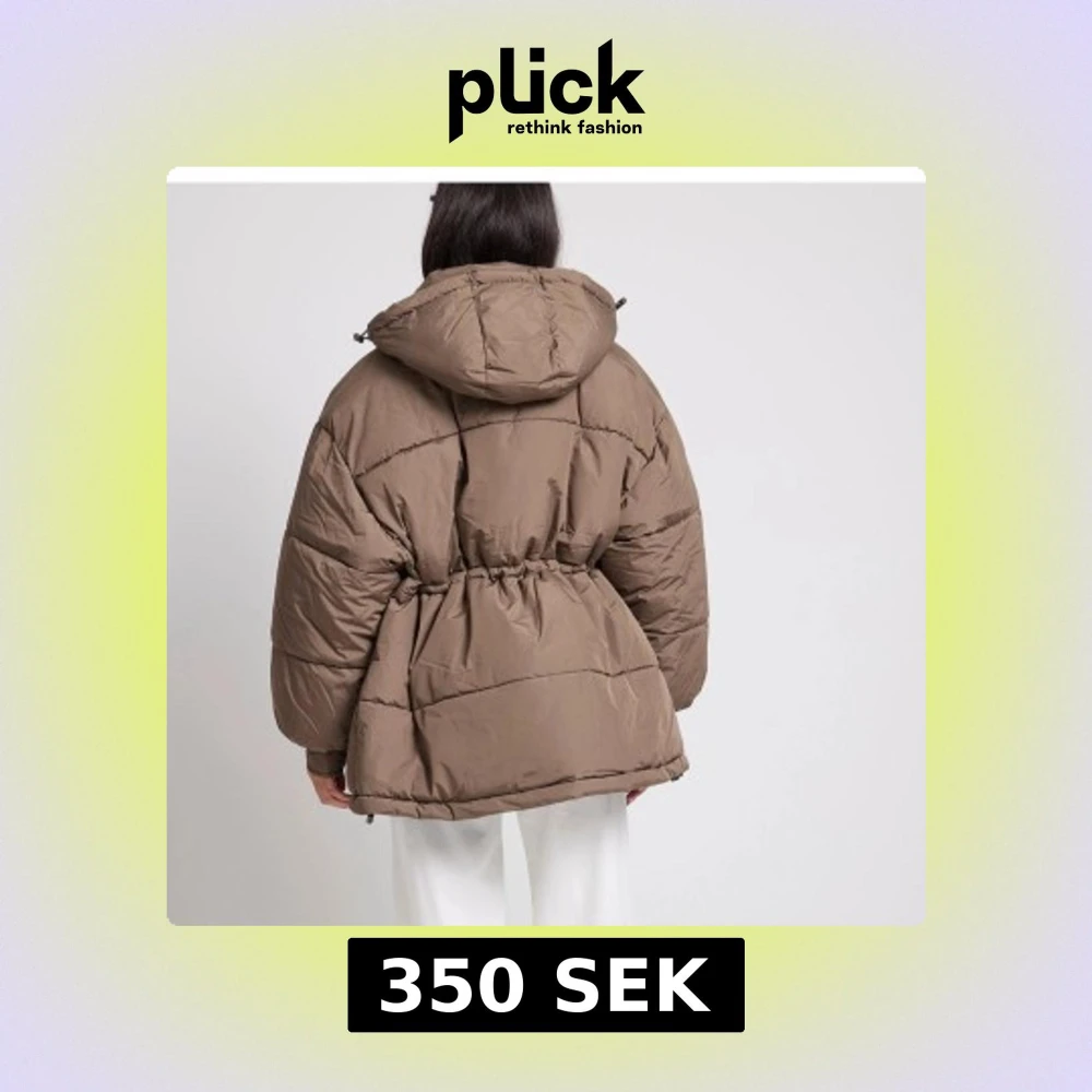 Säljer en brun pufferjacka med huva och dragkedja. Jackan har en oversized passform och långa ärmar, perfekt för kyliga dagar. Den har även knappar och elastisk midja för extra komfort.