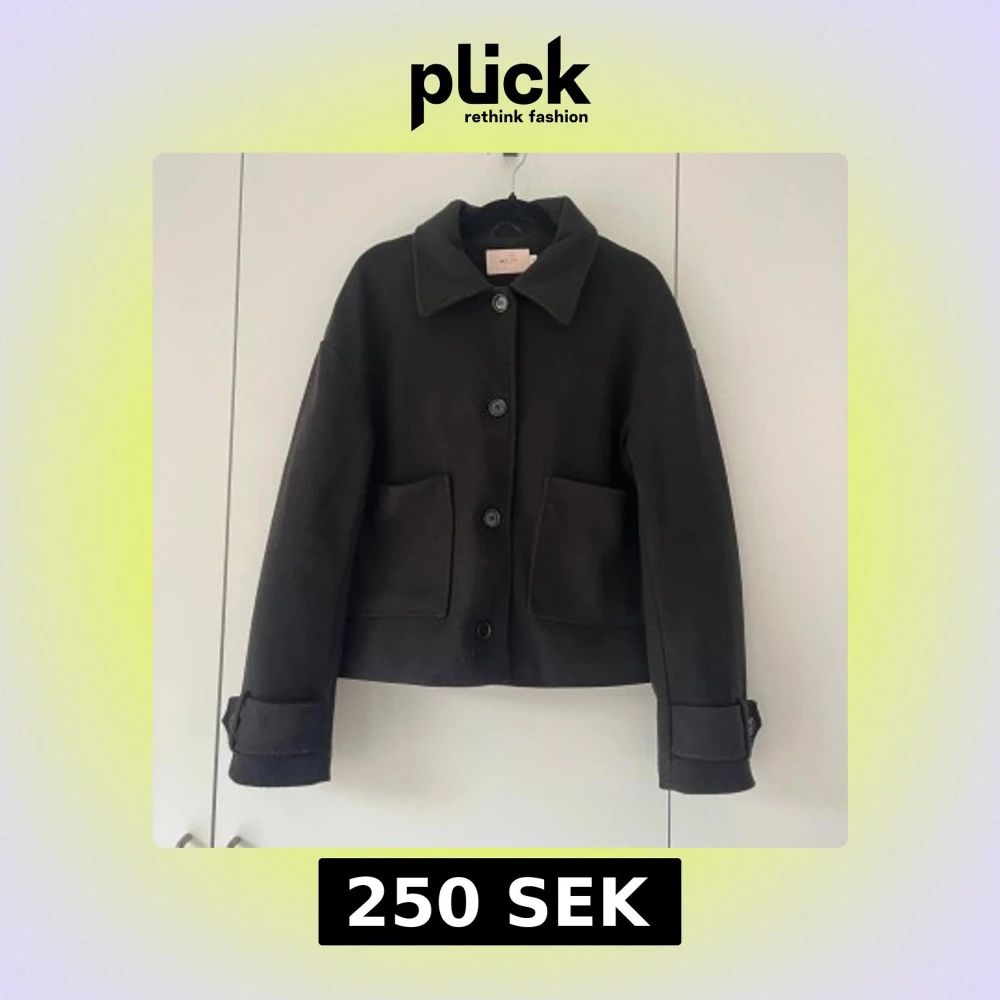 Stilren svart jacka från Nelly i ullblandning med klassisk krage, stora fickor framtill och knäppning med knappar. Jackan har långa ärmar med snygga detaljer vid ärmsluten.