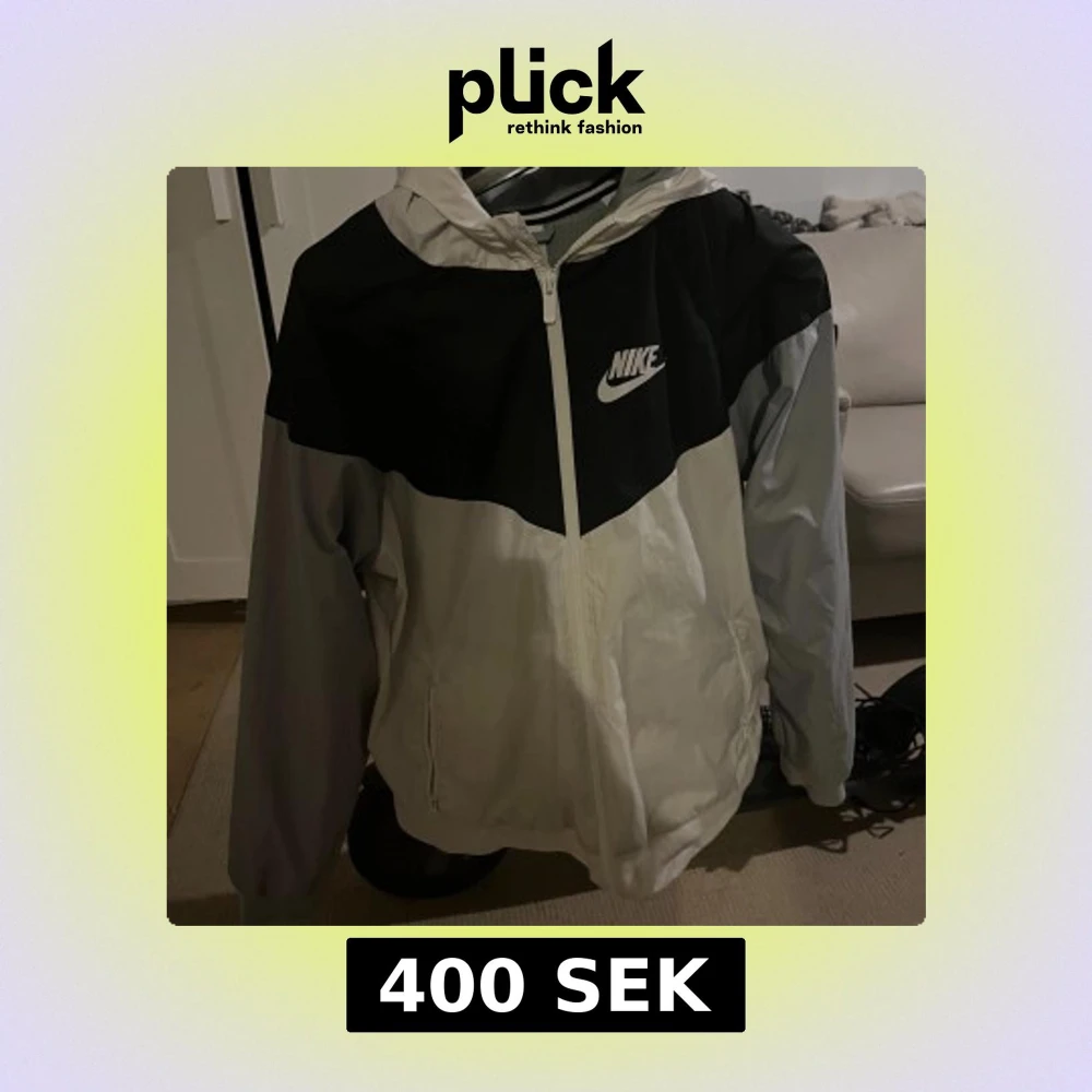 Nike vindjacka i svart, vitt och grått med huva och dragkedja framtill. Jackan har en sportig look med färgblock och klassisk Nike-logga på bröstet. Perfekt för dig som gillar streetwear och vill ha en lätt jacka med snygg passform.