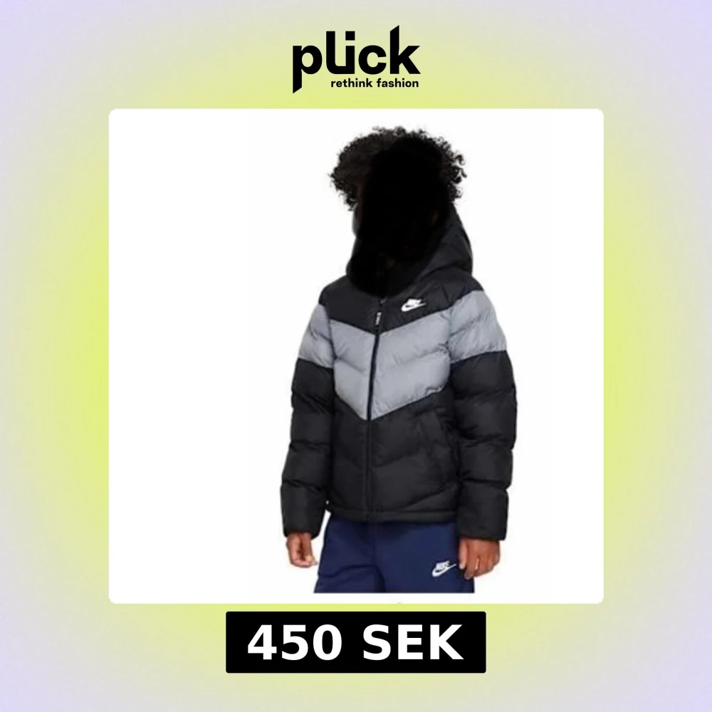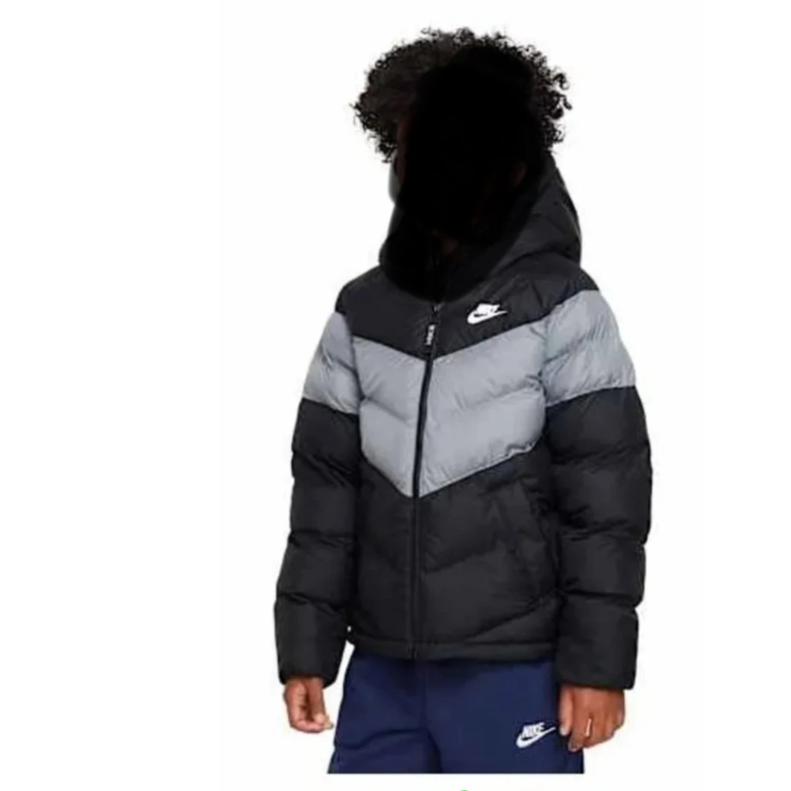 Snygg pufferjacka från Nike i svart och grått med coolt V-mönster över bröstet. Jackan har huva, dragkedja framtill och Nike-logga på bröstet. Perfekt för kalla dagar när du vill hålla stilen och värmen.
