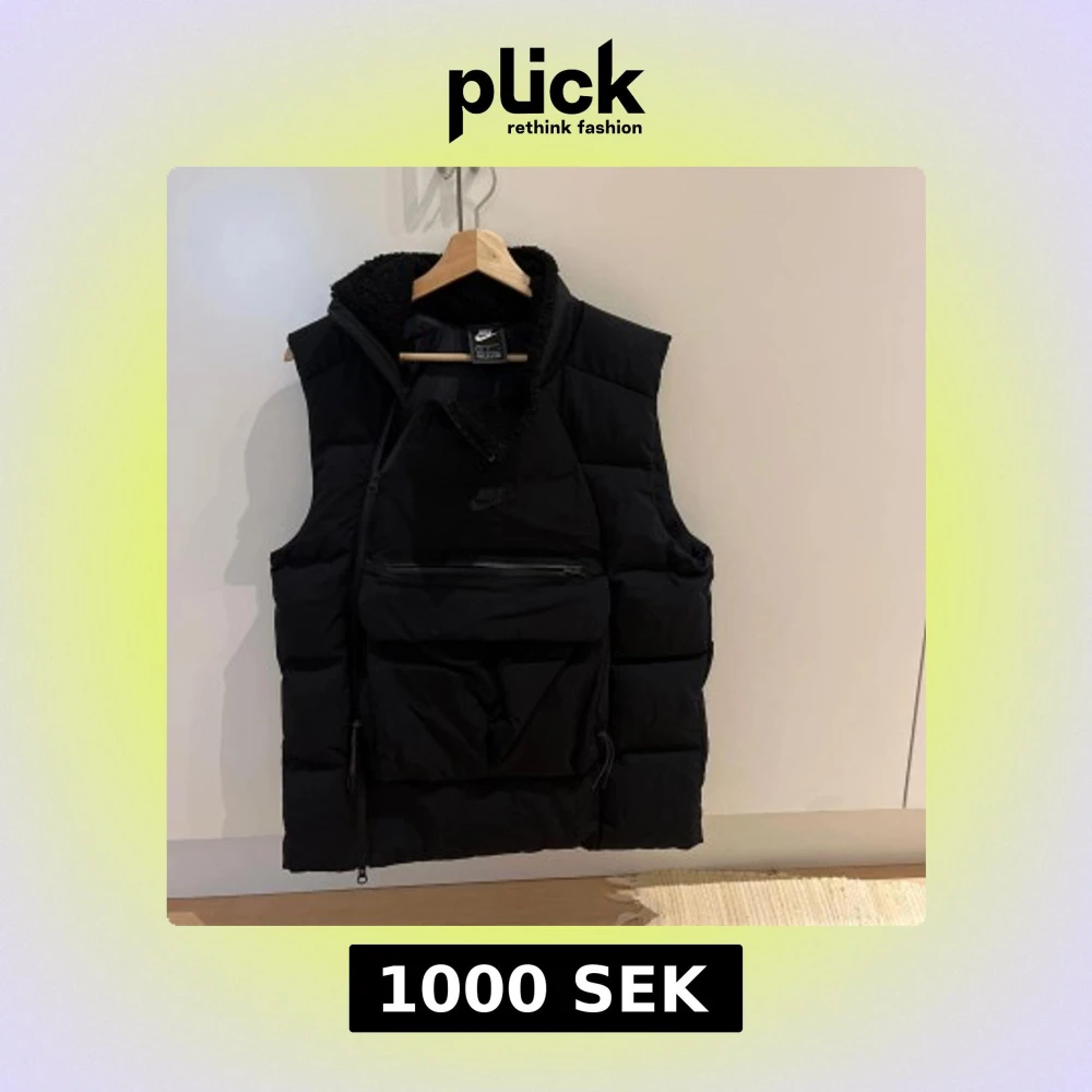 Säljer en svart dunväst från Nike med stor ficka framtill och dragkedja. Västen har hög krage med mjukt foder och diskret Nike-logga på bröstet. Perfekt för lager-på-lager och streetwear-stil.