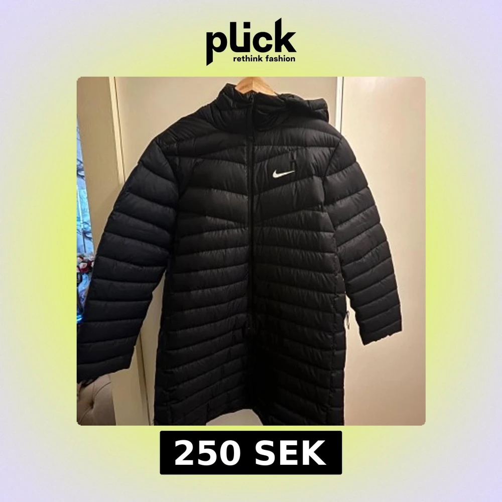 Säljer en svart, lång dunjacka från Nike med huva och vit logga på bröstet. Jackan har horisontella quiltade paneler och dragkedja framtill. Perfekt för kalla dagar och har en clean, sportig vibe. Passar dig som gillar streetwear och vill hålla dig varm.