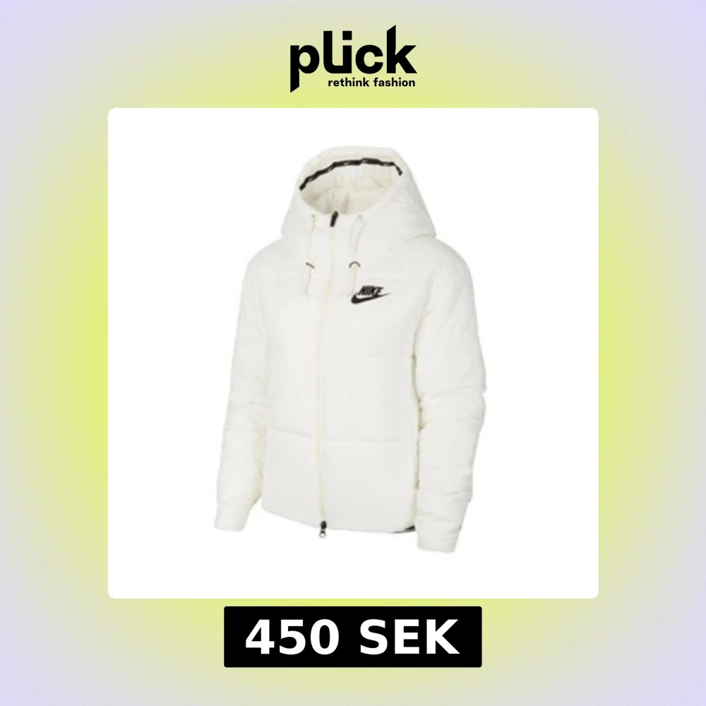 Säljer en fräsch vit pufferjacka från Nike med svart logga på bröstet. Jackan har huva med snörning, dragkedja framtill och quiltad design. Perfekt för kalla dagar när du vill hålla stilen och vara varm.