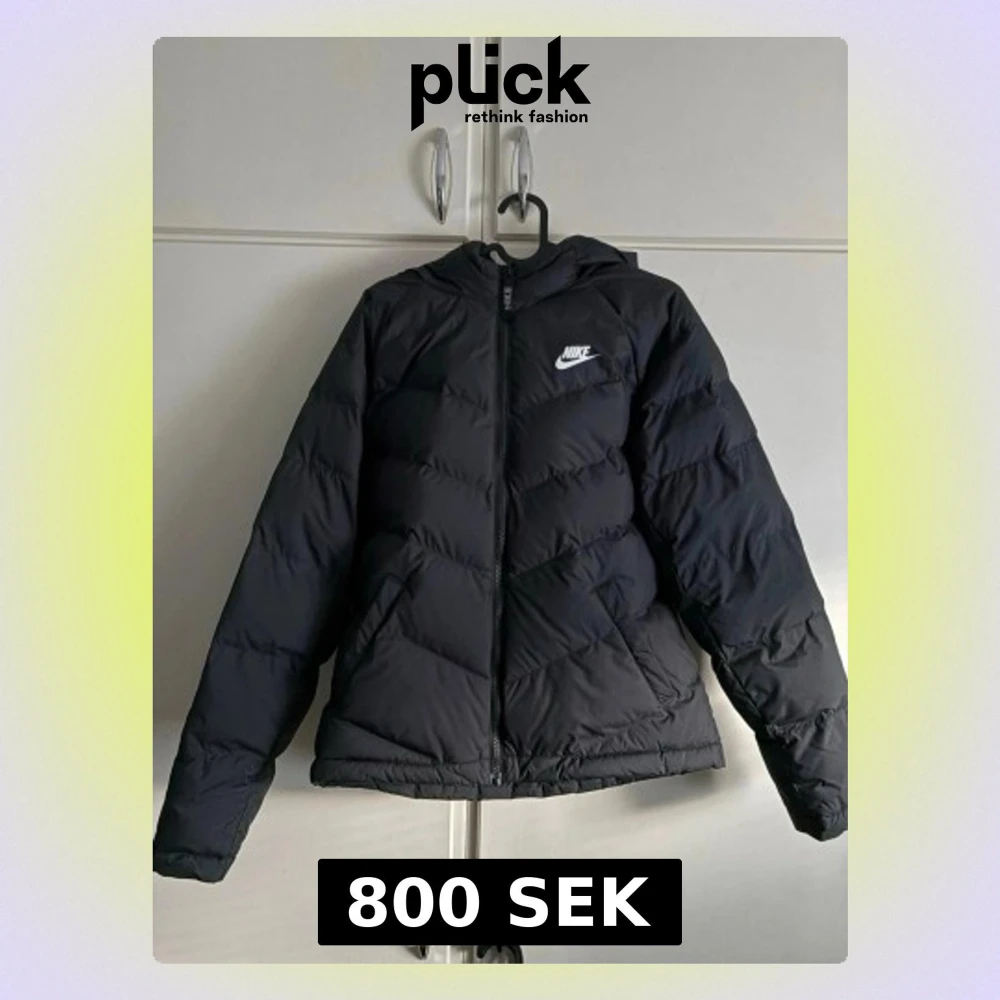 Svart pufferjacka från Nike i storlek XL, passar dig som är 158-170 cm. Jackan har huva, dragkedja framtill och klassisk Nike-logga på bröstet. Insidan har en 'Just Do It'-patch. Perfekt för kalla dagar och riktigt snygg streetstil.