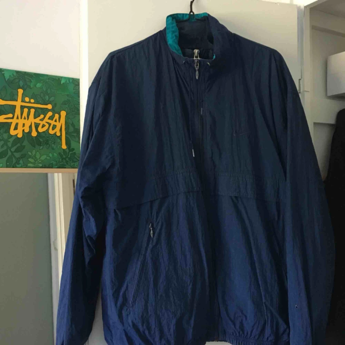 Nike Windbreaker Den är blå med turkosa detaljer och vit på insidan! Står inte storleken i jackan så har tagit utifrån mitt eget ögon och kroppsmått! Pris kan absolut diskuterad