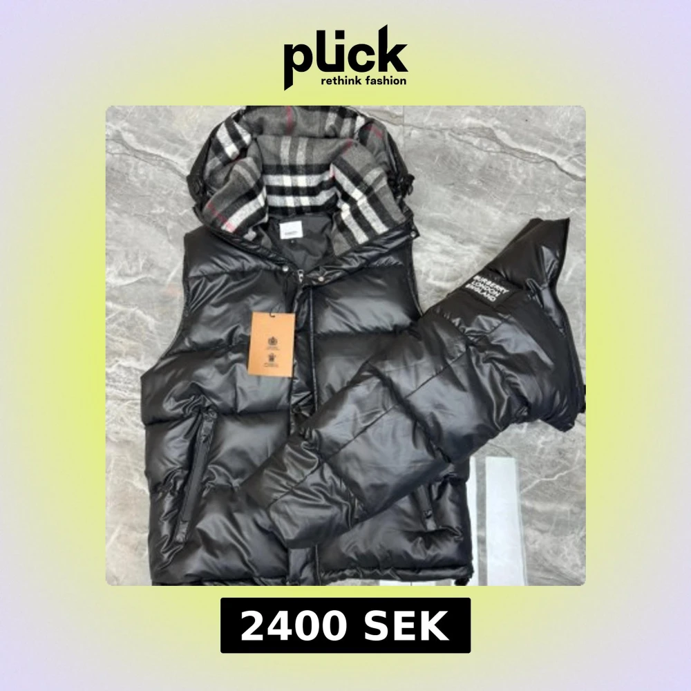 Snygg dunväst från Burberry med huva och klassiskt rutigt foder. Finns i svart och beige med dragkedja och knappar framtill, samt två sidofickor med dragkedja. Märkespatch på huvan och quiltad design ger en modern vibe.