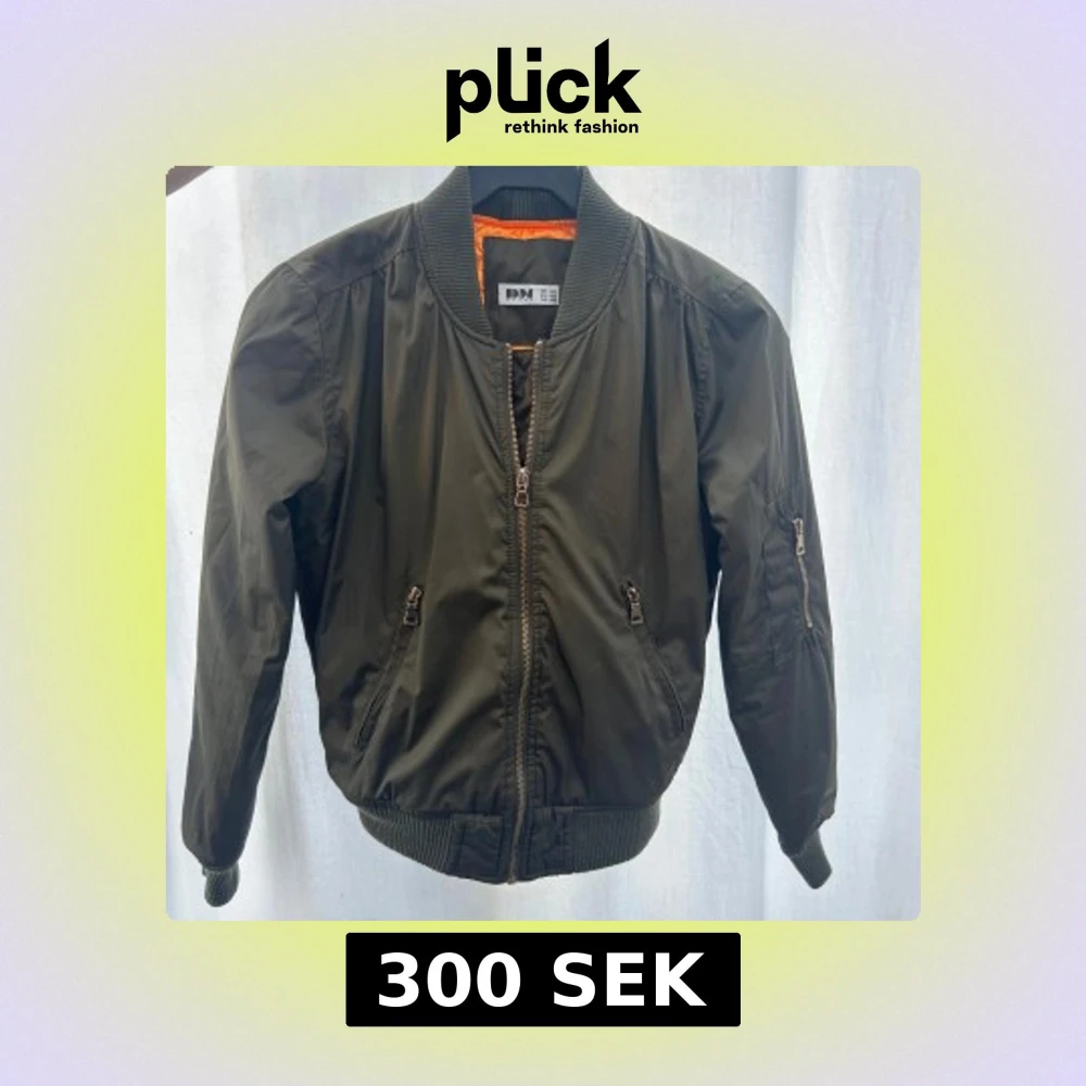 Snygg olivgrön bomberjacka från DM retro med orange insida, finns inte att få tag på längre då företaget slutat sälja den. Jackan har dragkedja framtill och på ärmen, samt ribbade muddar vid ärmslut och nederkant. Perfekt nu inför våren🌸💚
