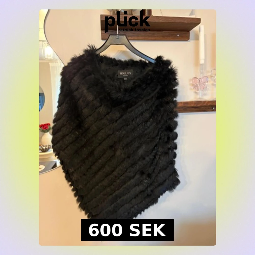 Säljer en svart pälsponcho från Hollies med snyggt snedrandigt mönster.