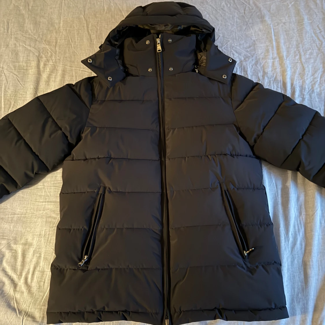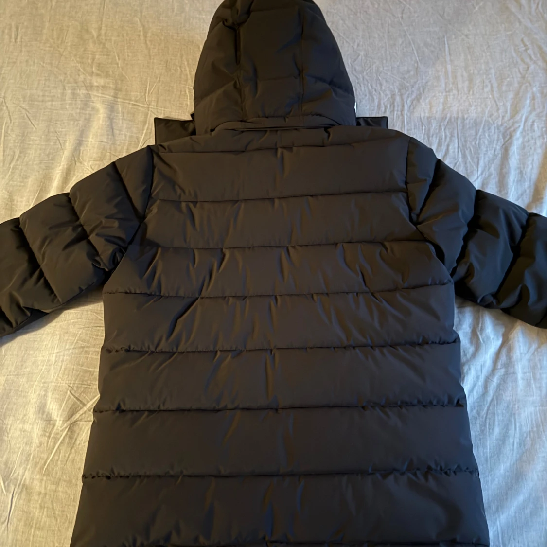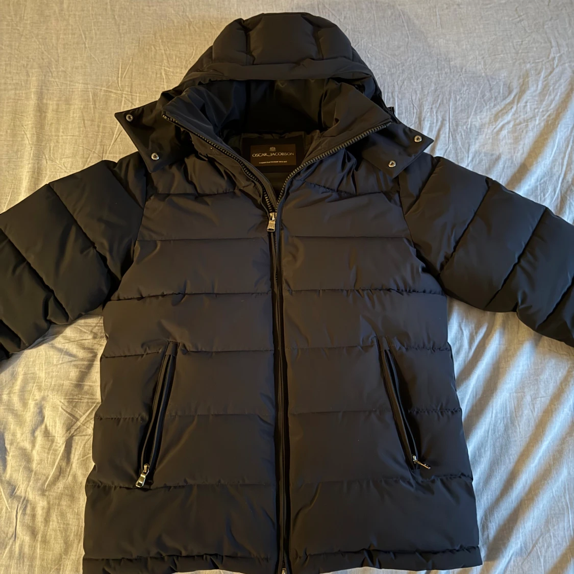 Marinblå pufferjacka från Oscar Jacobson med huva och dragkedja framtill. Jackan har två sidofickor med dragkedja och är quiltad i breda horisontella sektioner. Insidan är fodrad med blankt syntetmaterial och jackan har en clean, modern look. Storlek 46 vilket är detsamma som storlek S. Den är helt ny, inga hål eller slitage. Köpte för 4500 kr. Säljer för 4000 kr. Köpt på Collection of Brands. Kan gå ner i pris vid snabb affär