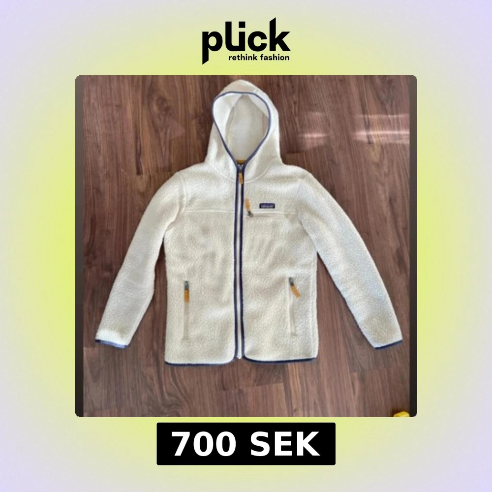 Säljer en vit teddyjacka från Patagonia med huva och blå detaljer. Jackan har dragkedja framtill, tre fickor med dragkedja och mysigt fleece-material. Perfekt för kyliga dagar och har en clean, sportig look.