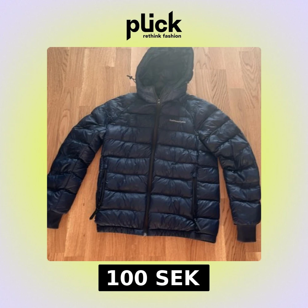 Snygg mörkblå dunjacka från Peak Performance med huva och dragkedja framtill. Jackan är quiltad och har två dragkedjefickor på sidorna. Perfekt för kalla dagar och riktigt skön att ha på sig. Storlek 160
