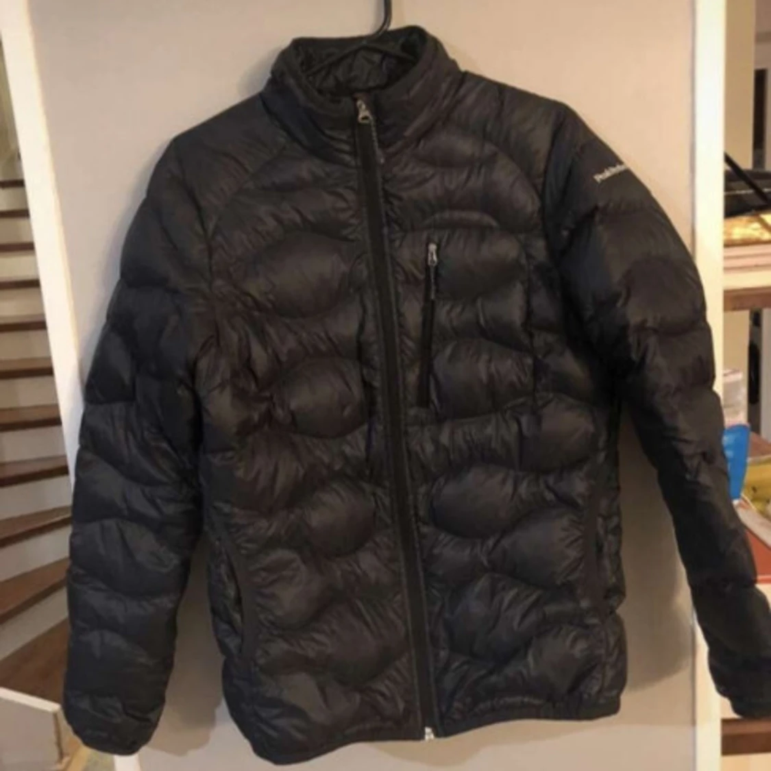 Säljer en svart dunjacka från Peak Performance. Jackan har en dragkedja framtill och en bröstficka med dragkedja.