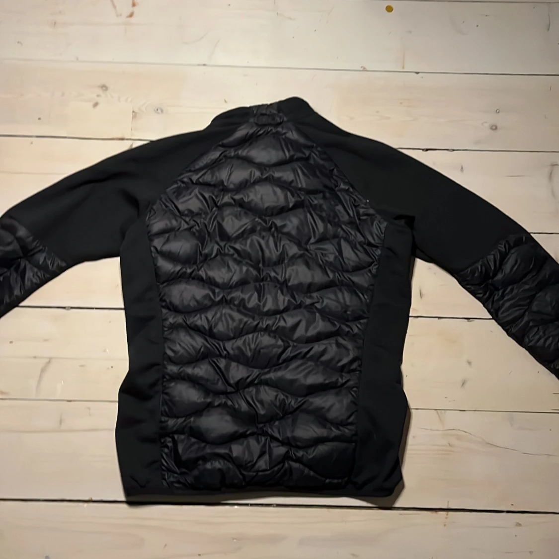 Säljer en svart Cardigen från Peak Performance med quiltade detaljer och dragkedja framtill. Jackan har långa ärmar och en stilren design, perfekt för kyligare dagar. Den är både funktionell och snygg, med en passform som sitter bra på kroppen.