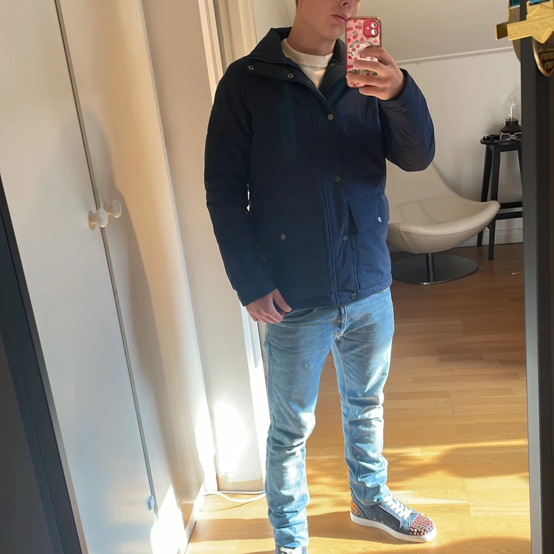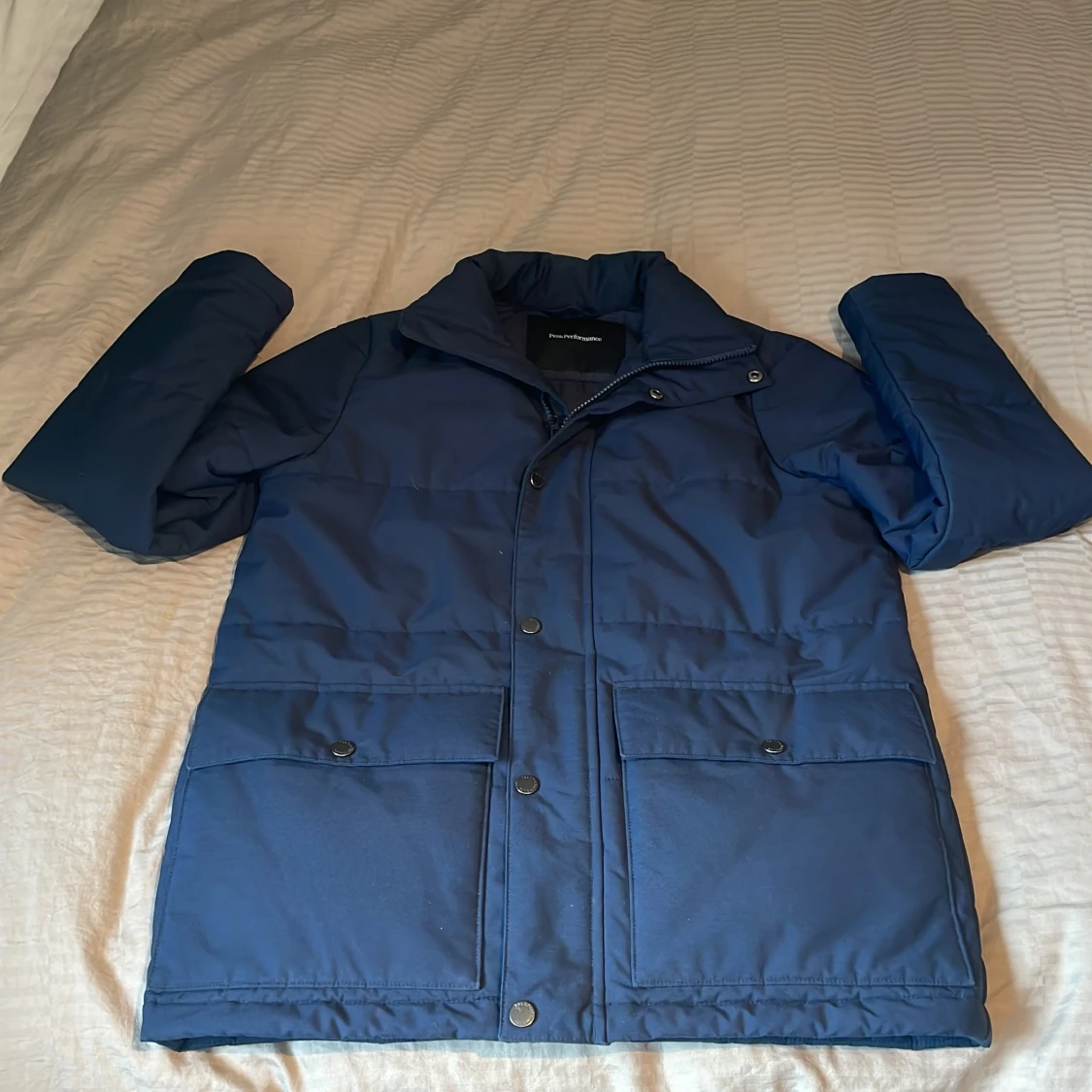 Snygg mörkblå pufferjacka från Peak Performance i storlek S. Jackan har två stora fickor framtill med knappar, hög krage och dragkedja med knappslå. Perfekt för kyliga dagar och har en clean, stilren look. Priset är inte hugget i sten. Skriv om ni har funderingar.