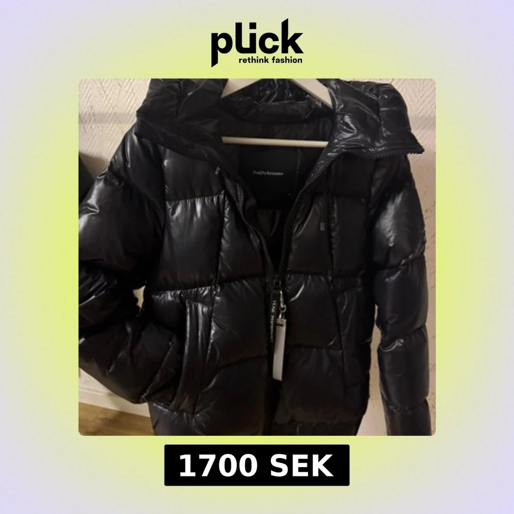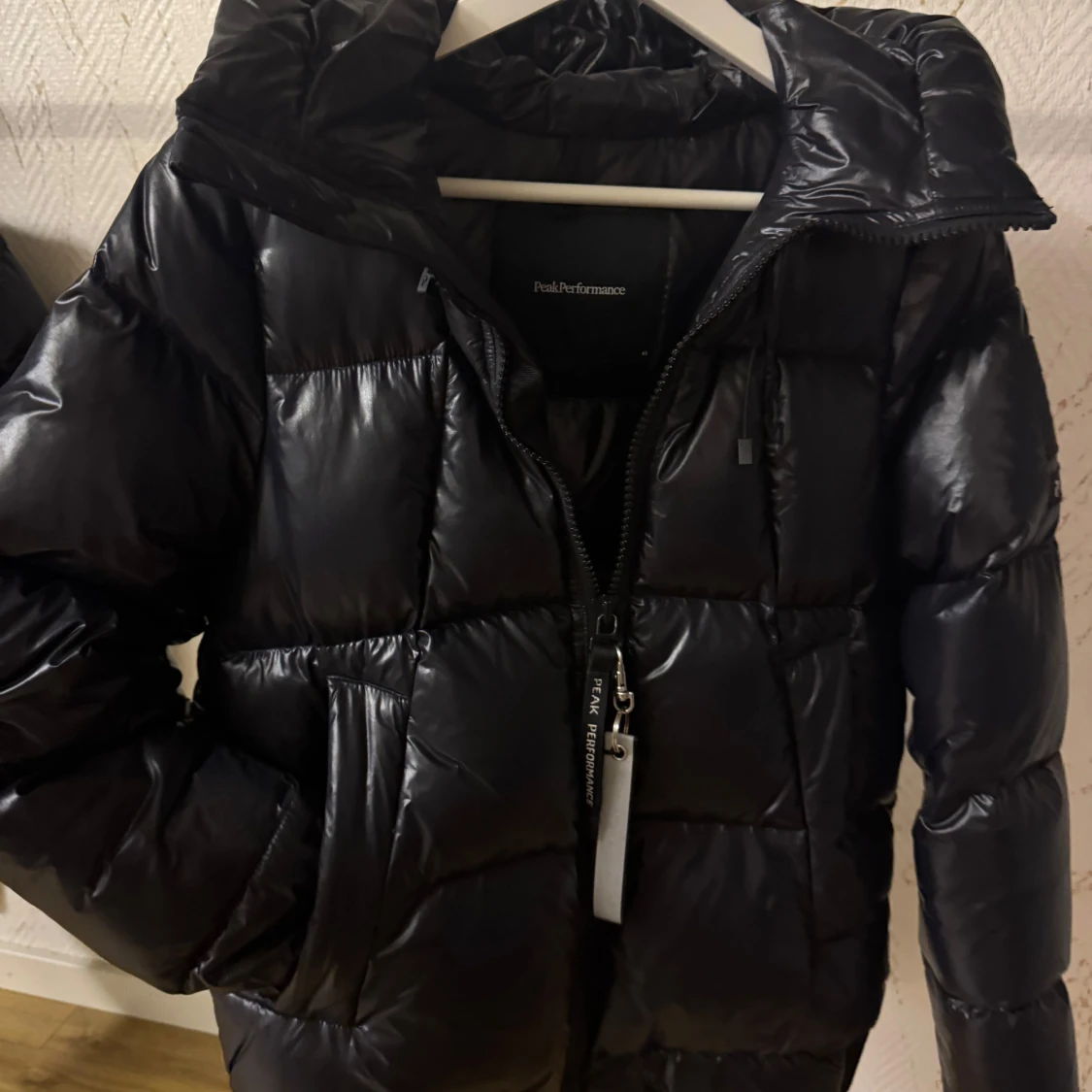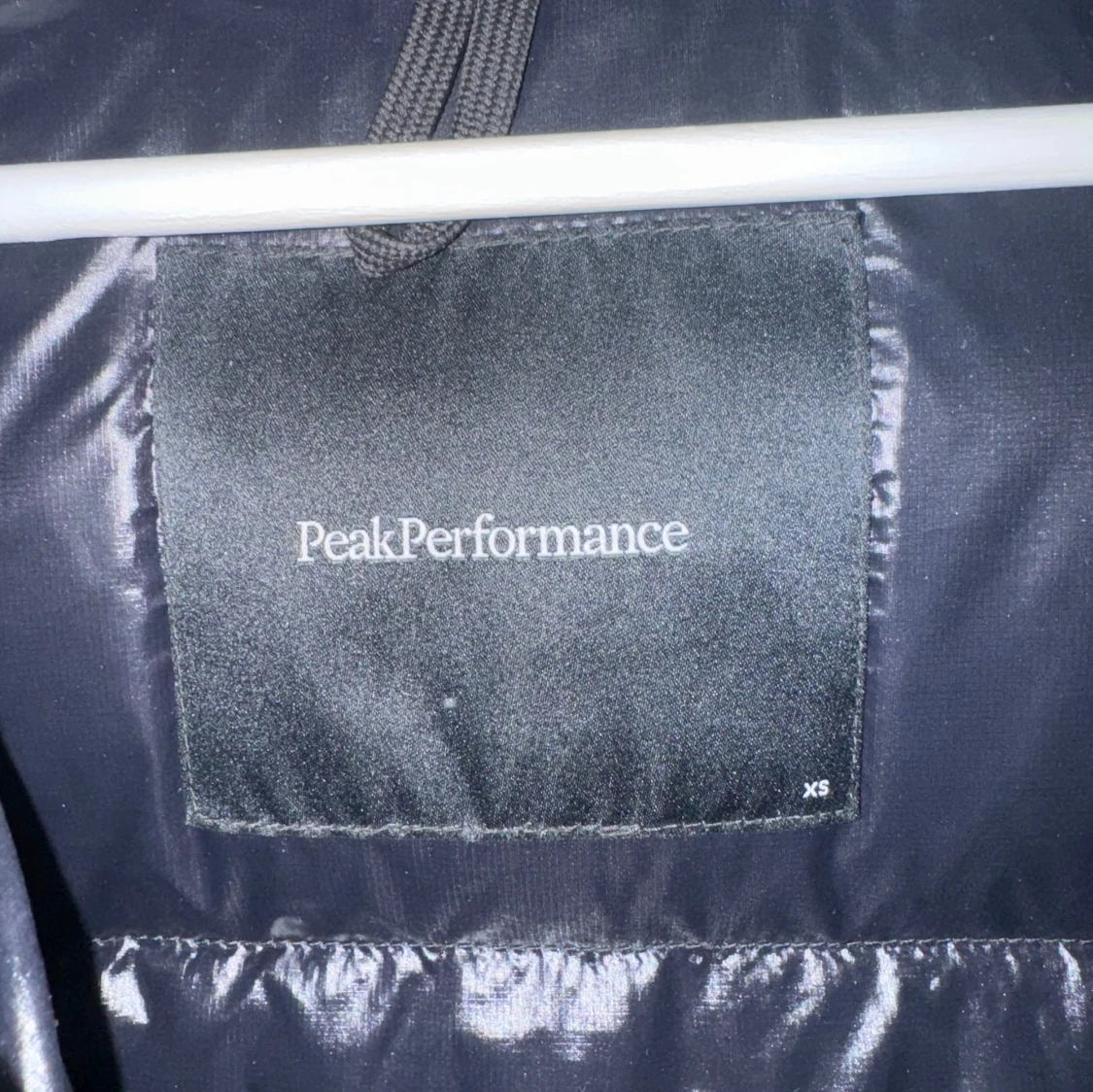 Säljer en svart pufferjacka från Peak Performance i storlek XS. Jackan har en glansig finish, huva, två sidofickor och dragkedja framtill med Peak Performance-nyckelring. Perfekt för kalla dagar och har en schysst, lite oversized look.