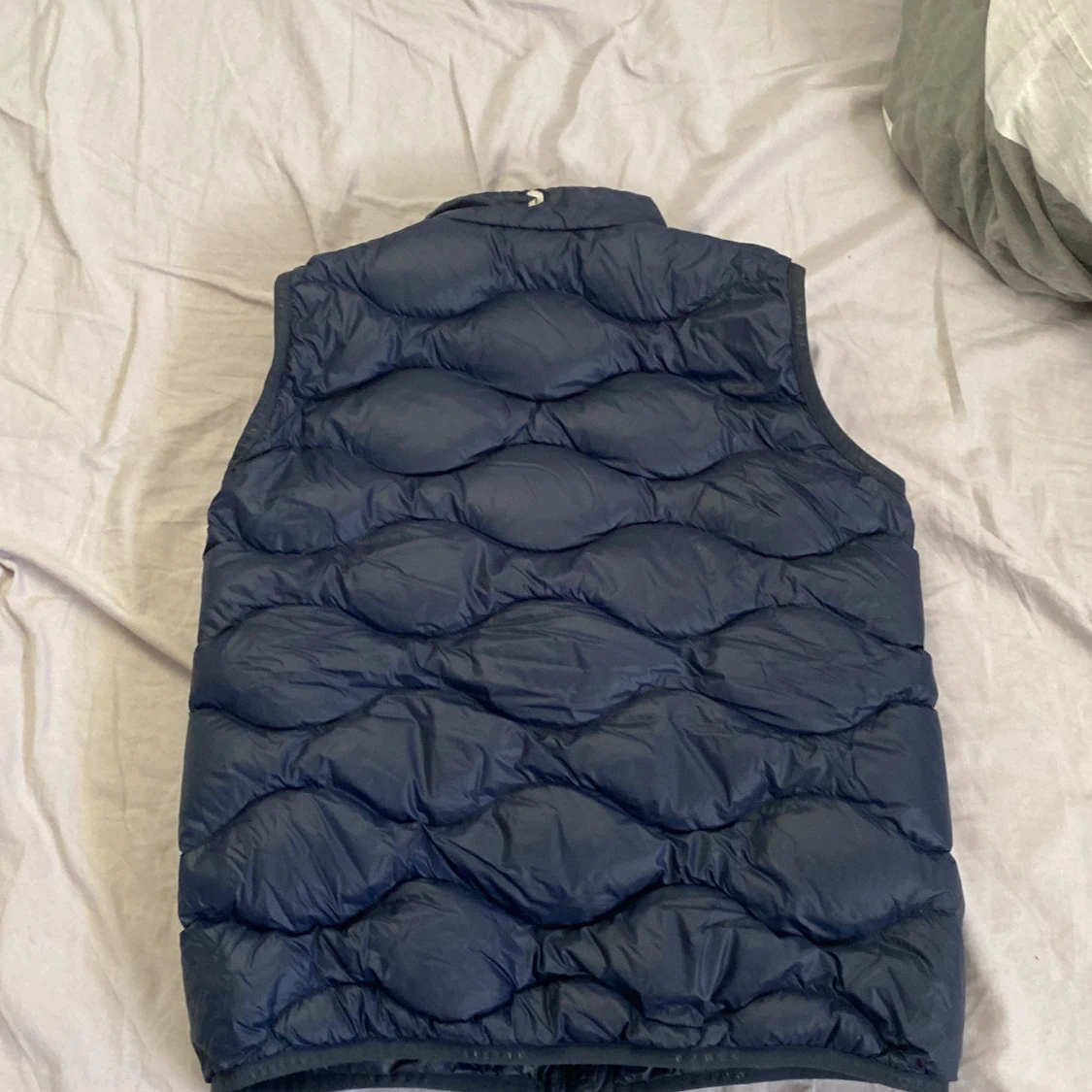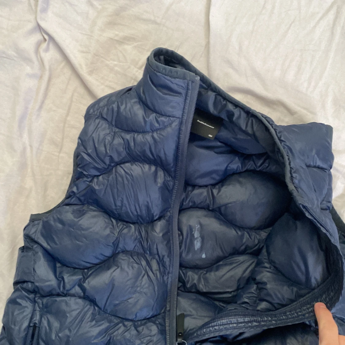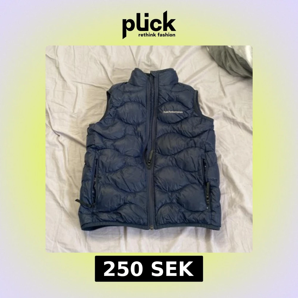 Snygg blå dunväst från Peak Performance med quiltad design och hög krage. Ger en rikigt fräsch och clean look den är i storlek 15 men passar xs. Det enda negativa är en liten fläck i insidan men syns ej när den är på.