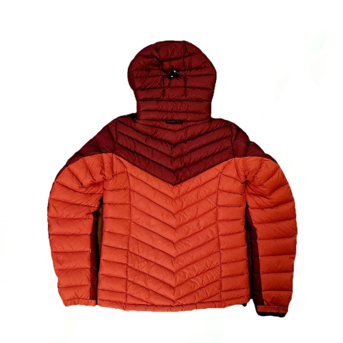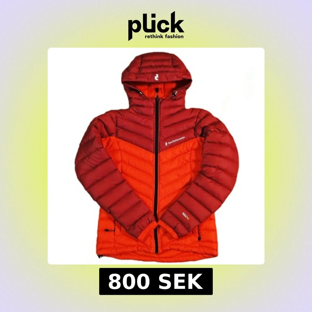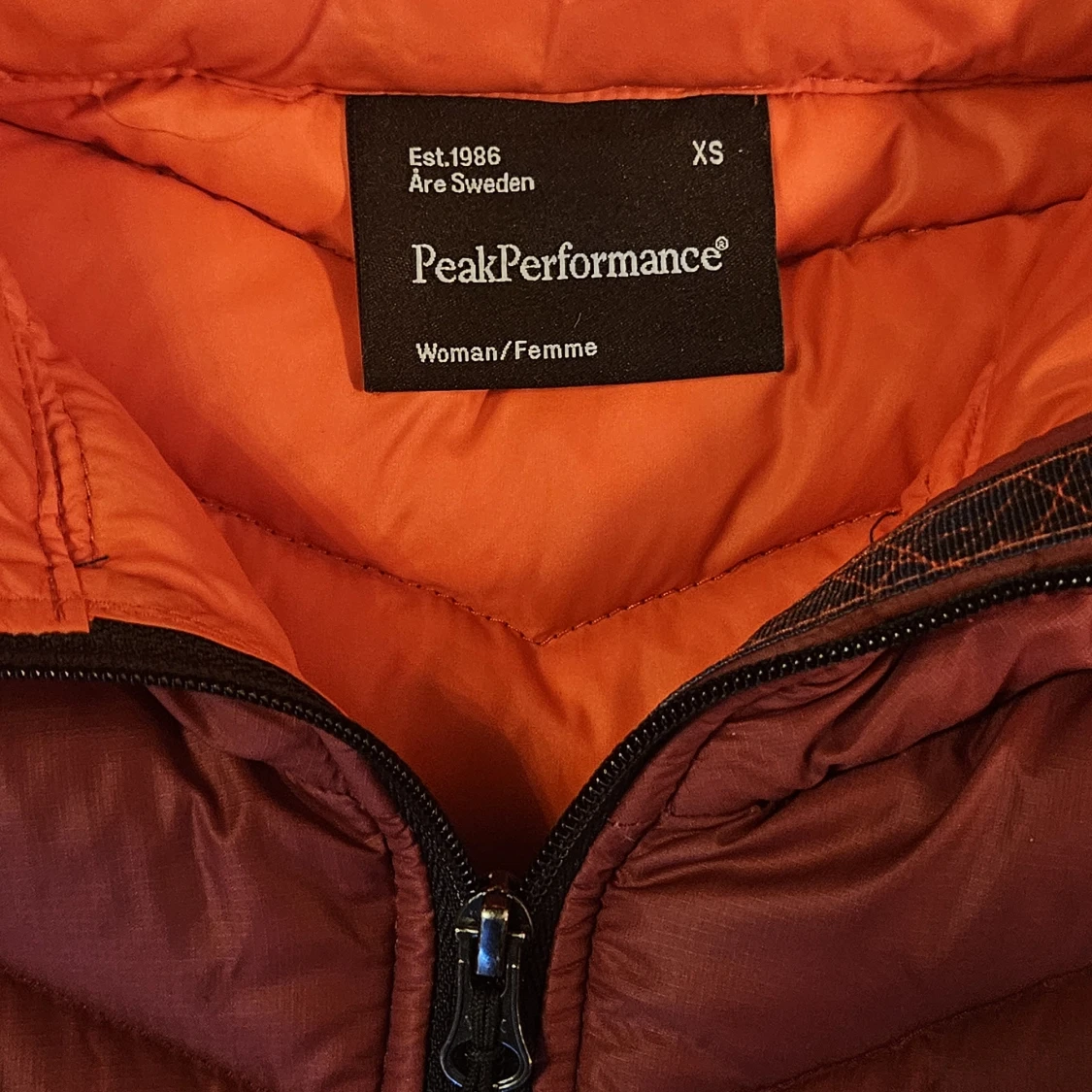 Peak Performance dunjacka i storlek XS med schysst färgblock i rött och orange. Jackan har huva, hel dragkedja och snyggt mönstrad quiltning. Perfekt för kalla dagar och riktigt lätt att bära. Logga på bröstet och ärmen.
