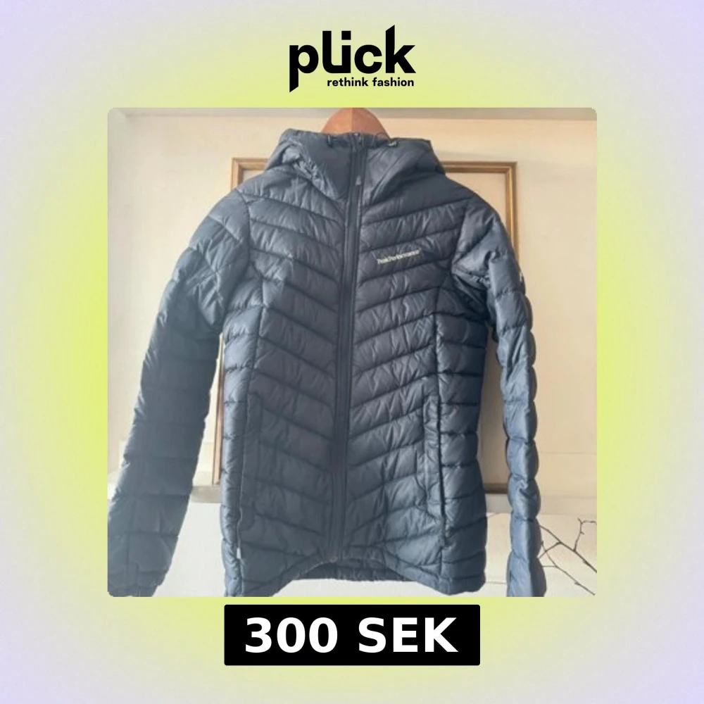 Säljer en marinblå pufferjacka från Peak Performance med huva och dragkedja framtill. Jackan har en sportig look och är lätt vadderad, perfekt för kyliga dagar. Snygg och enkel design med logga på bröstet.