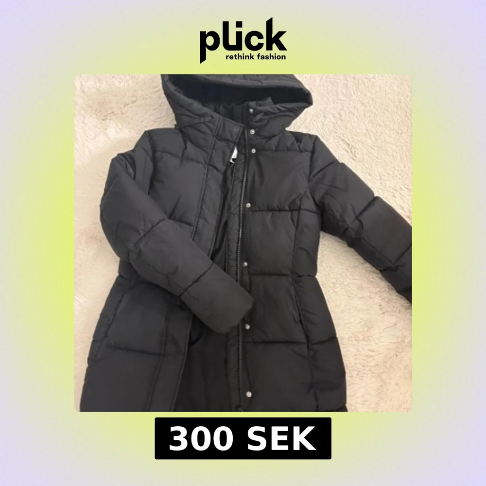 Svart lång pufferjacka från H&M med huva och dragkedja framtill. Jackan har quiltad design, tryckknappar och är perfekt för kalla dagar. Snygg och enkel stil som håller dig varm hela vintern.