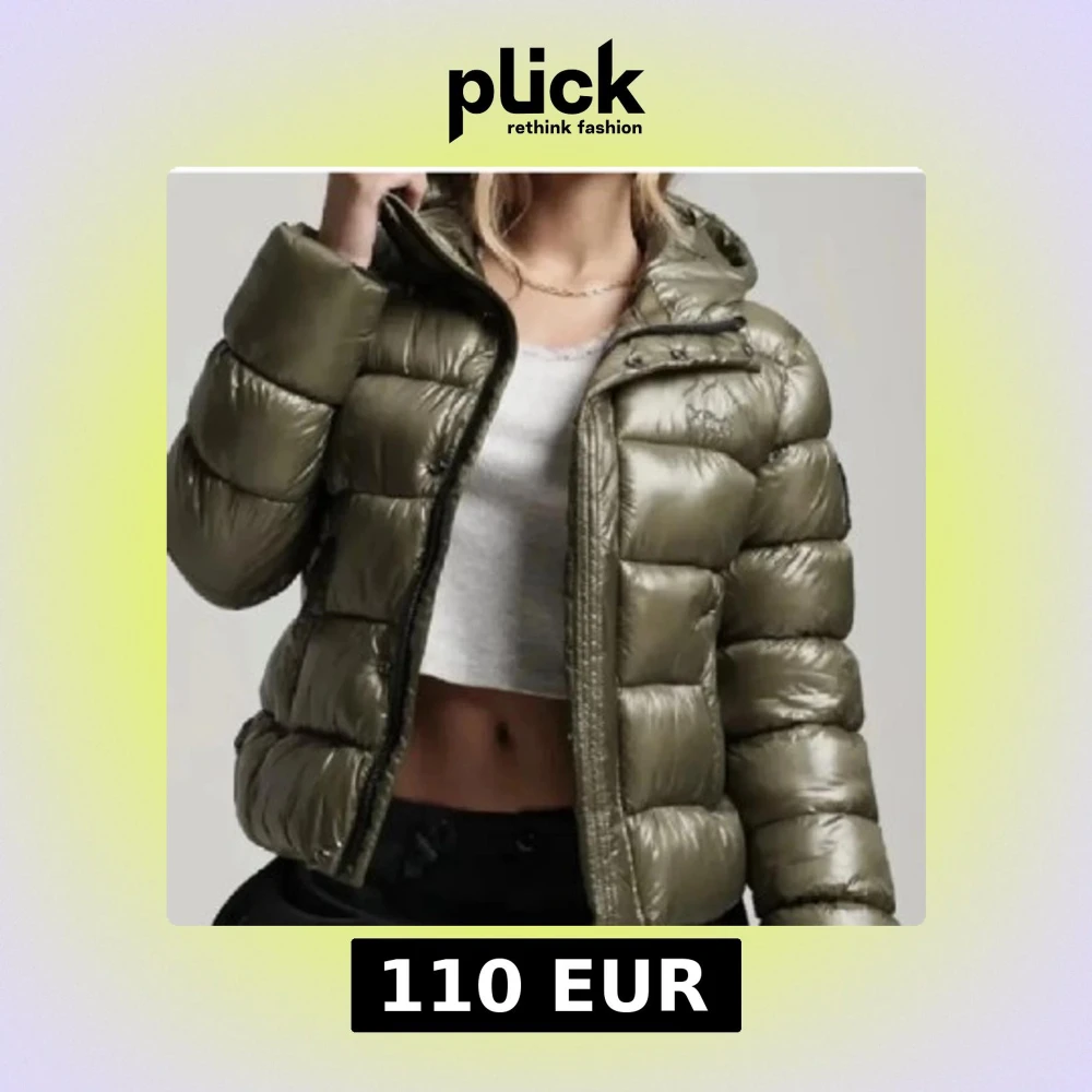 Snygg olivgrön pufferjacka med dragkedja. Jackan har en glansig yta och är perfekt för kyligare dagar. Den har långa ärmar och en hög krage för extra värme.