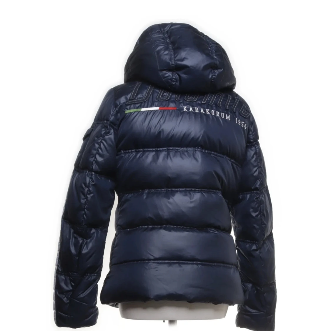 Snygg mörkblå dunjacka från Dolomite med huva och broderad logga på bröstet. Jackan har quiltad design, dragkedja framtill och broderad text på ryggen. Perfekt för kalla dagar.