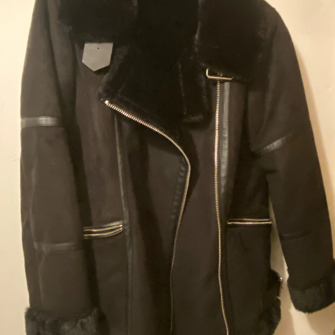 Snygg svart jacka med pälsdetaljer och dragkedja framtill. Jackan har en klassisk design med långa ärmar och en mjuk krage. Perfekt för kyligare dagar.