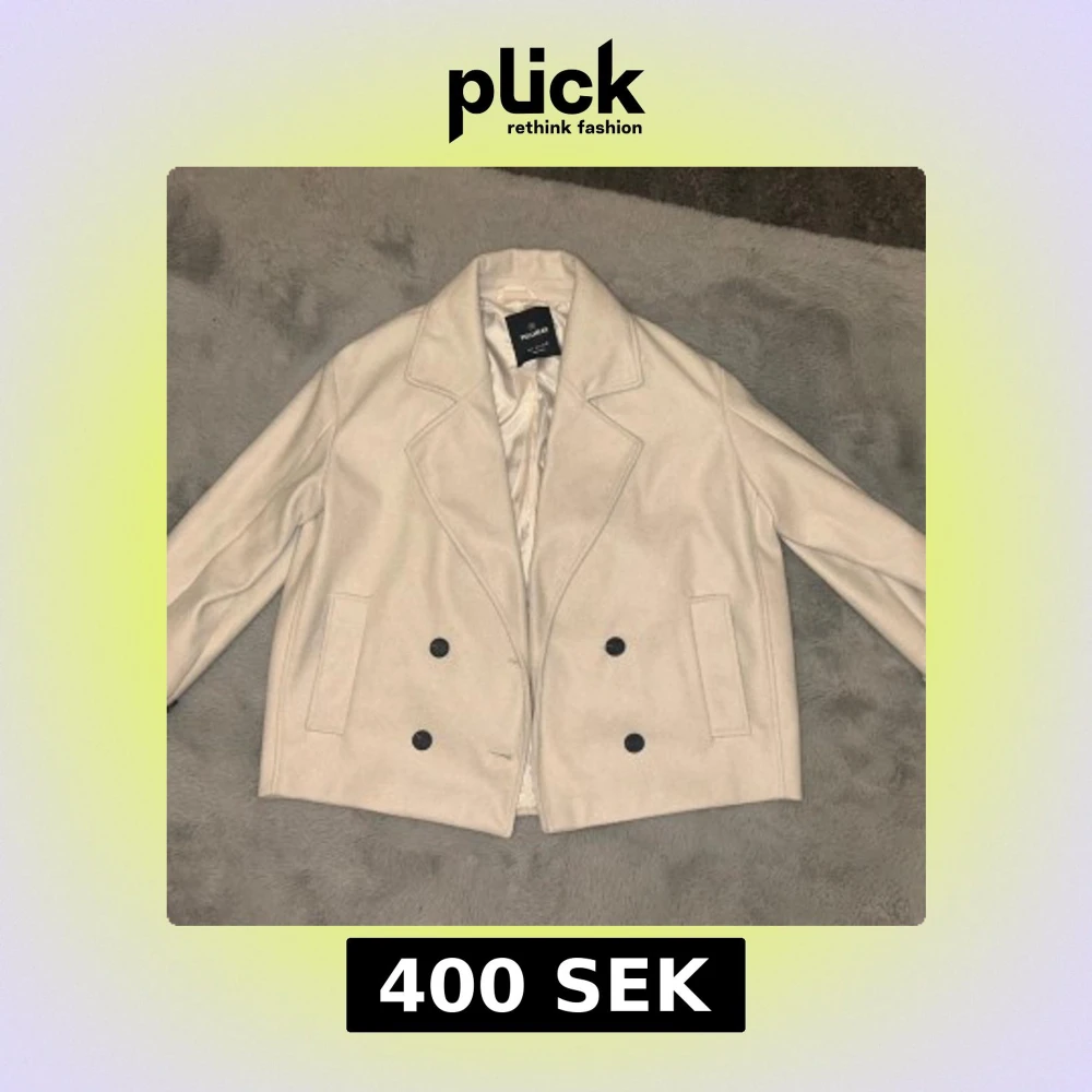Stilren beige skepparkavaj från Pull&Bear med dubbelknäppning och stora svarta knappar. Sitter som XL, endast använd en gång men inga tecken på det.