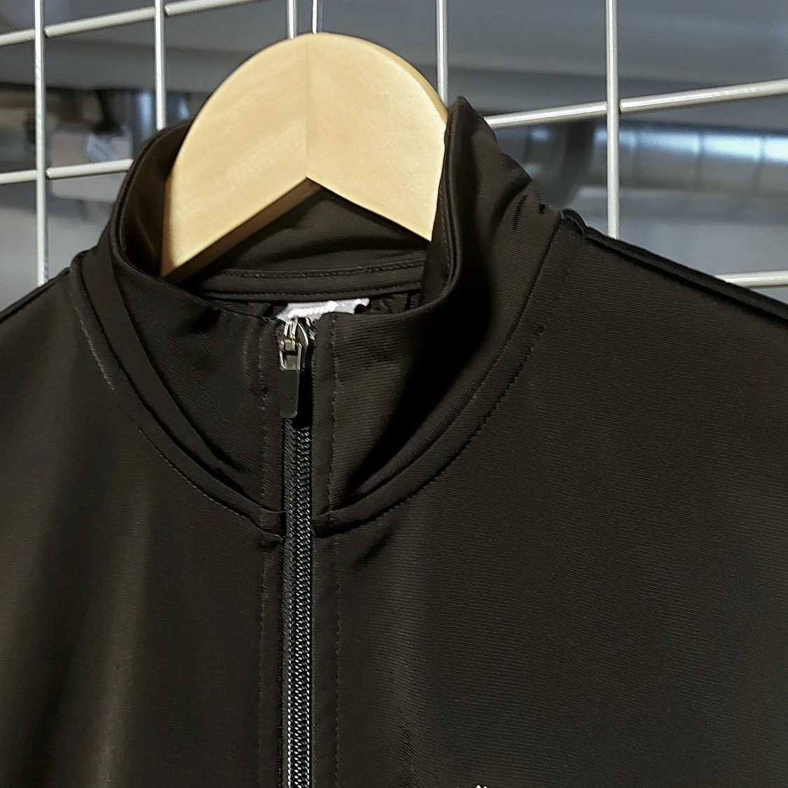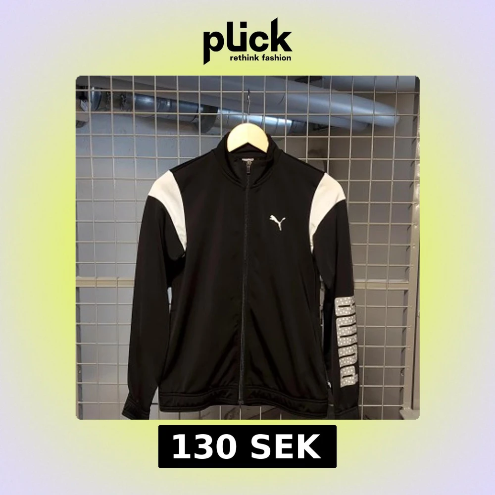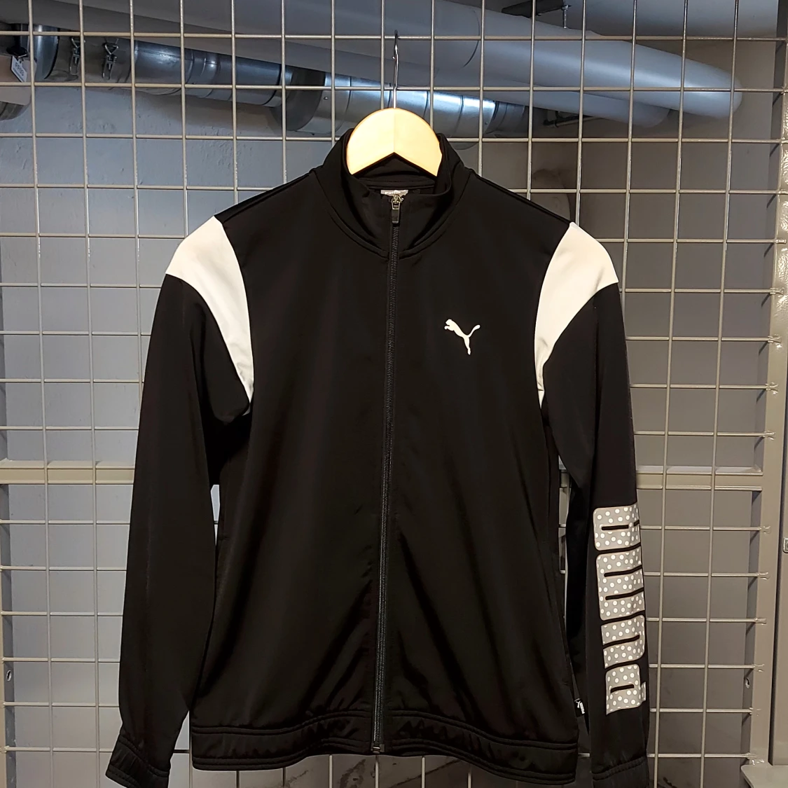 Svart träningsjacka från Puma med vita detaljer på axlarna och ärmen. Jackan har dragkedja framtill, lång ärm och ett tryckt Puma-logo på bröstet. Materialet är slätt och sportigt, perfekt för träning eller chill.