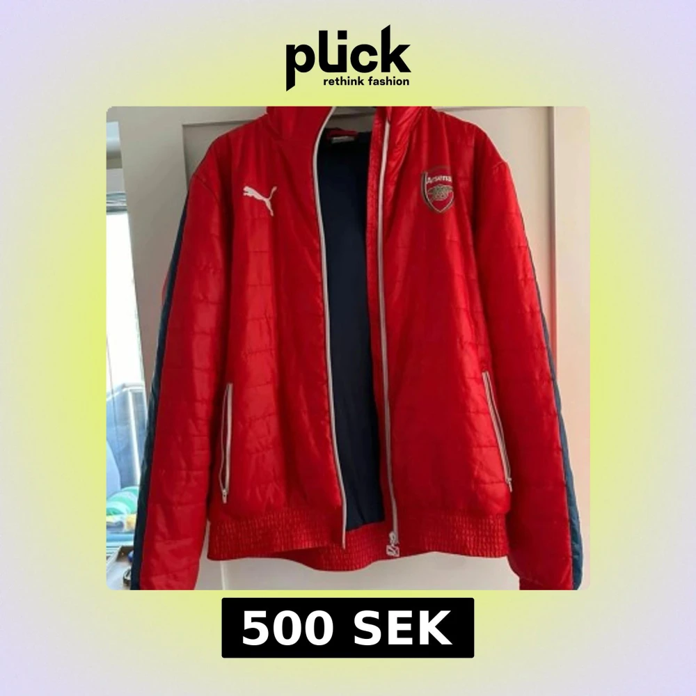 Säljer en röd quiltad Arsenal jacka från Puma med huva och dragkedja. Jackan har vita detaljer, blå insida på huvan och blå ränder längs ärmarna. Perfekt för fotbollsfans som vill visa sitt stöd för Arsenal.