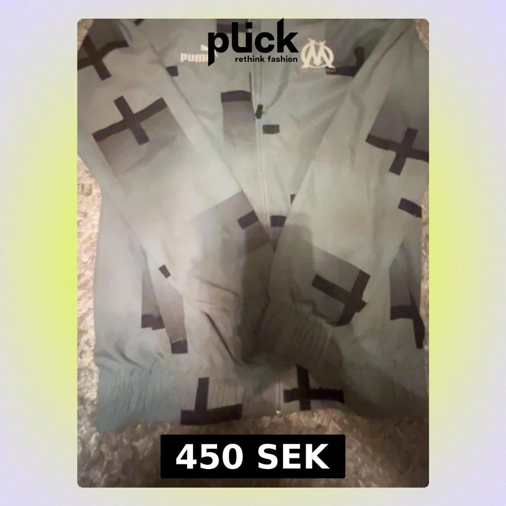 Grå vindjacka från Puma i samarbete med Olympique de Marseille. Jackan har svart korsmönster, dragkedja framtill och elastiska muddar. Materialet är lätt och syntetiskt med meshfoder. Marseille-logga på bröstet och Puma-logga på både bröst och rygg.
