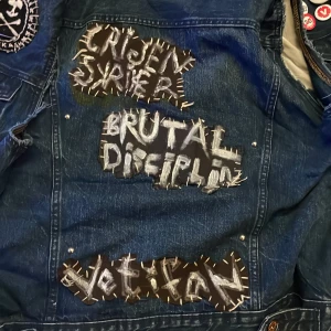 Patch väst med olika patches, pins och nitar. Grisen skriker, asta kask, Stockholms n-grer och vetifan.