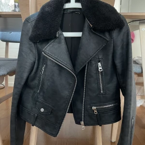 Svart kort skinnjacka med avtagbar pälskrage i storlek S. Från ZARA.