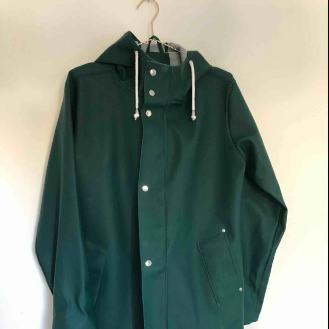 Jättefin grön regnjacka. I princip helt oanvänd, därav mycket bra skick. Köparen betalar frakten.