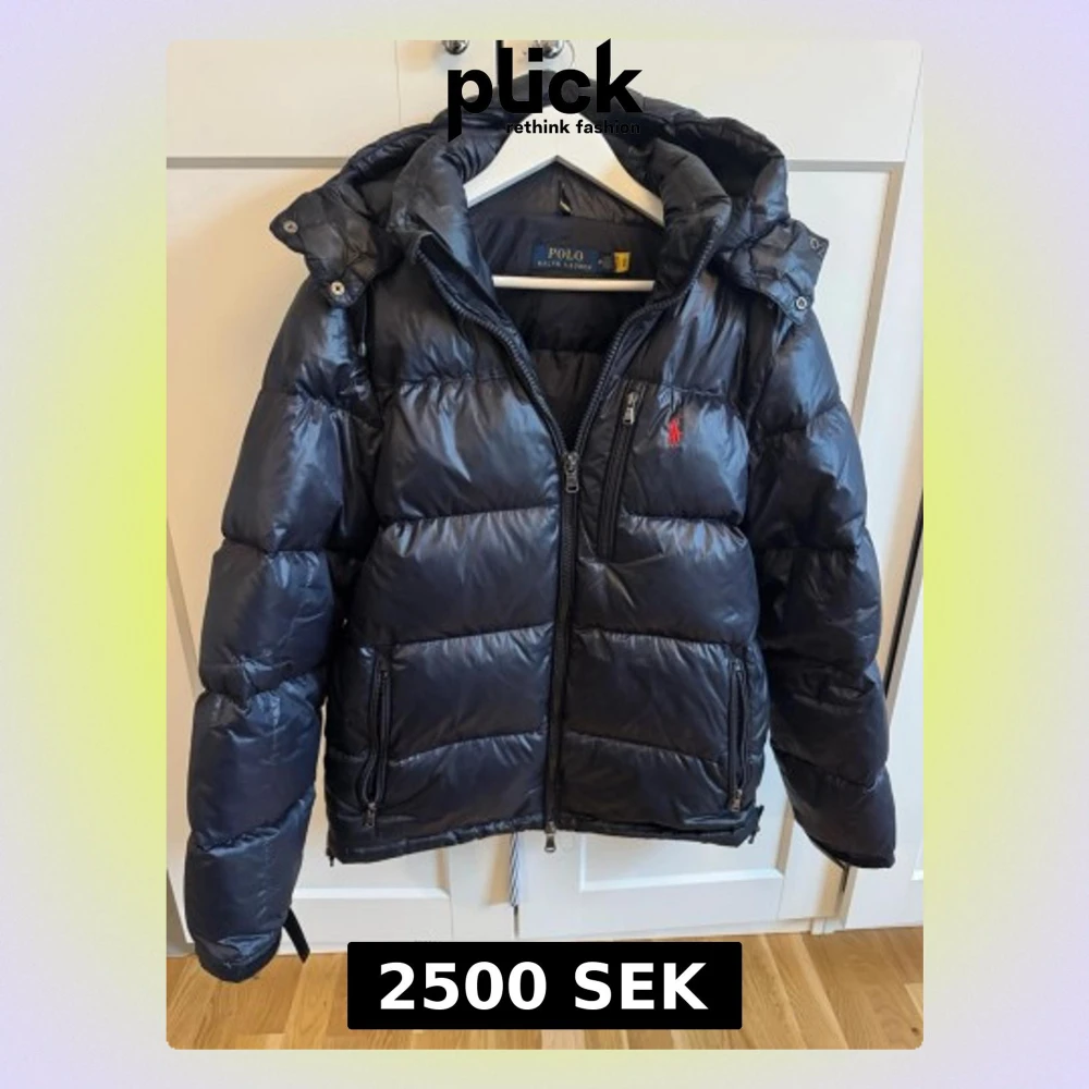 Snygg marinblå pufferjacka från Polo Ralph Lauren med huva och dragkedjor framtill. Hel och i fint skick när man tittar på jackan. Pyttelitet hål under luvan, mindre än ett knapphål. Höger ärm, litet hål samt på mudden (se bild). Köpt på Hede outlet i Kungsbacka för ett år sedan. För liten för sonen nu därav försäljningen.