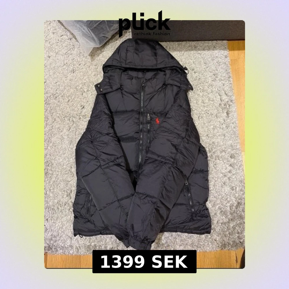 Säljer en svart pufferjacka från Polo Ralph Lauren med huva och dragkedja framtill.