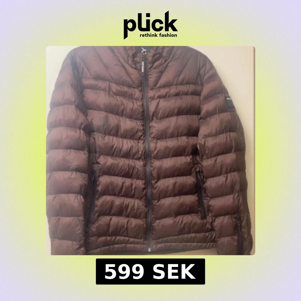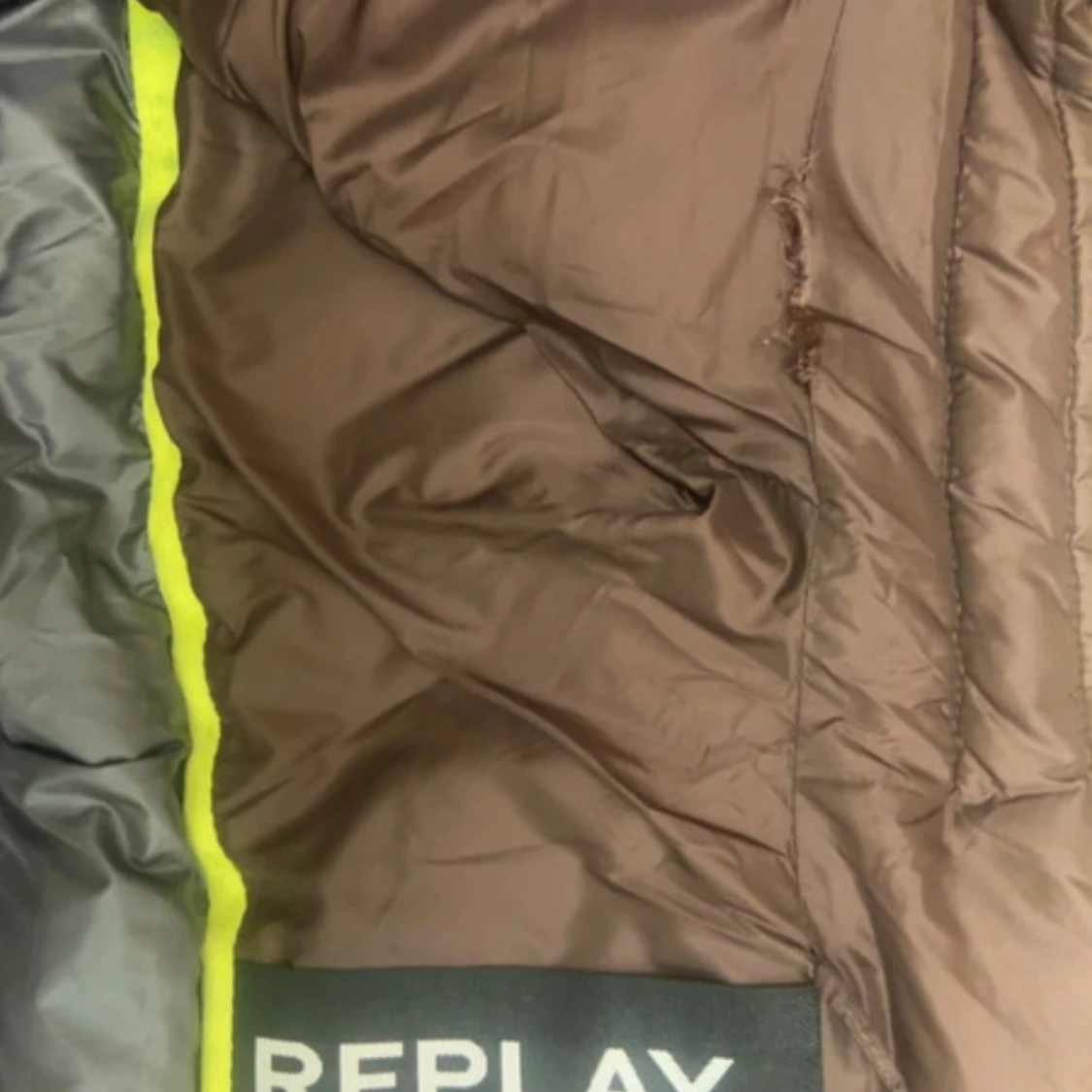 Snygg brun pufferjacka från Replay i storlek L. Jackan har quiltad design, dragkedja framtill och två sidofickor med svarta dragkedjor. Insidan är grå med gul detalj och Replay-logga på ärmen. Perfekt för kalla dagar och har en modern, loose Fint skick förutom en en tråd som gått upp (se foton för skick ) Inget annat att anmärka på
