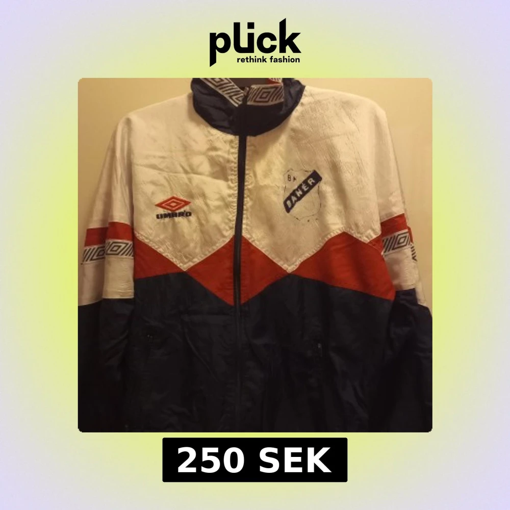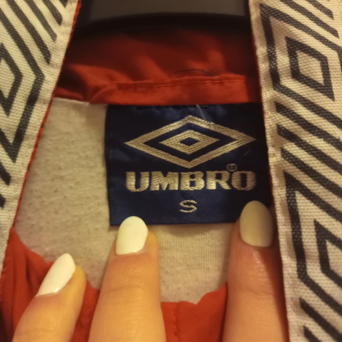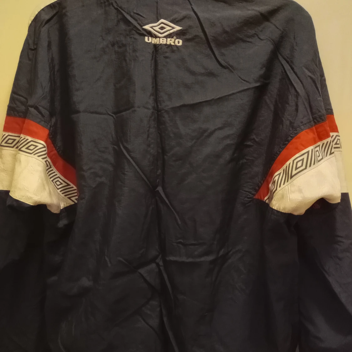 Säljer en retro vindjacka från Umbro i blått, vitt och rött. Jackan har ett klassiskt mönster med Umbro-logga på bröstet och ryggen. Den har långa ärmar och dragkedja framtill. Perfekt för en sportig look!