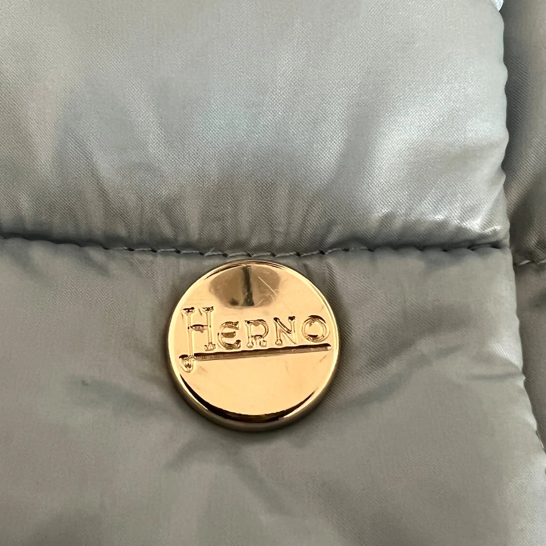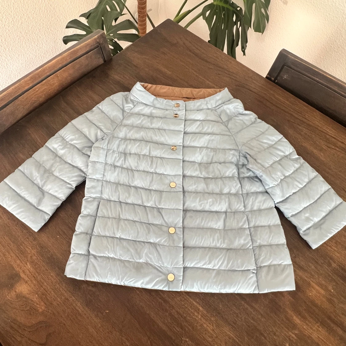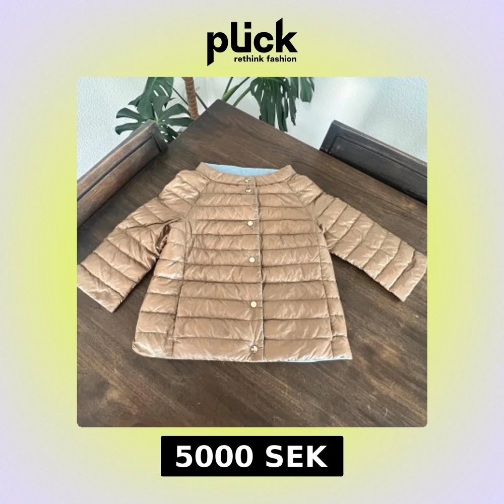 Snygg reversibel pufferjacka från Herno med raka, quiltade paneler och guldfärgade knappar. Ena sidan är ljusblå och andra sidan är beige, vilket gör den superenkel att matcha. Jackan har trekvartsärmar och en stilren, kraglös design. Perfekt för dig som gillar att variera din look.