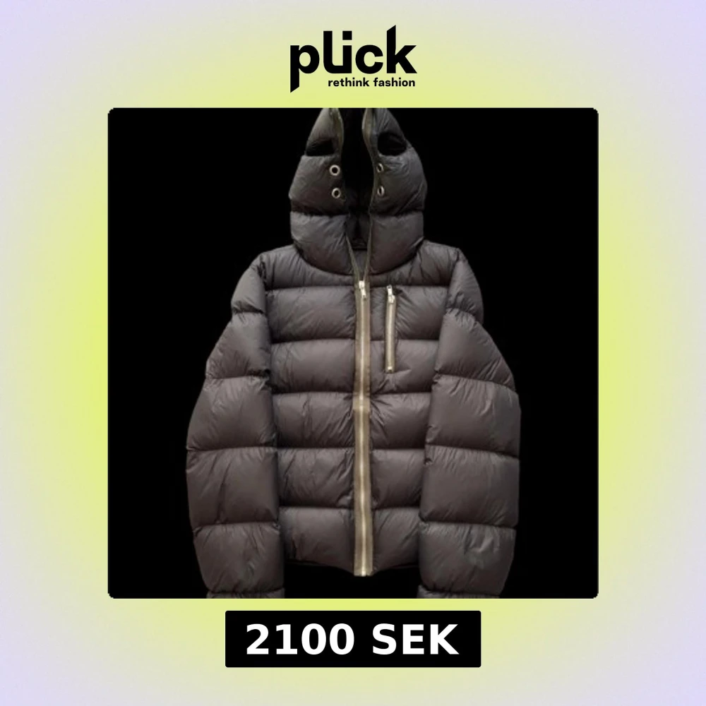 Svart pufferjacka från Rick Owens Strobe FW22 med stor huva och grov dragkedja framtill. Jackan har quiltad design, lång ärm och en extra bröstficka med dragkedja. Materialet är syntet och dun, perfekt för kalla dagar. Snygg och edgy look med oversized passform.