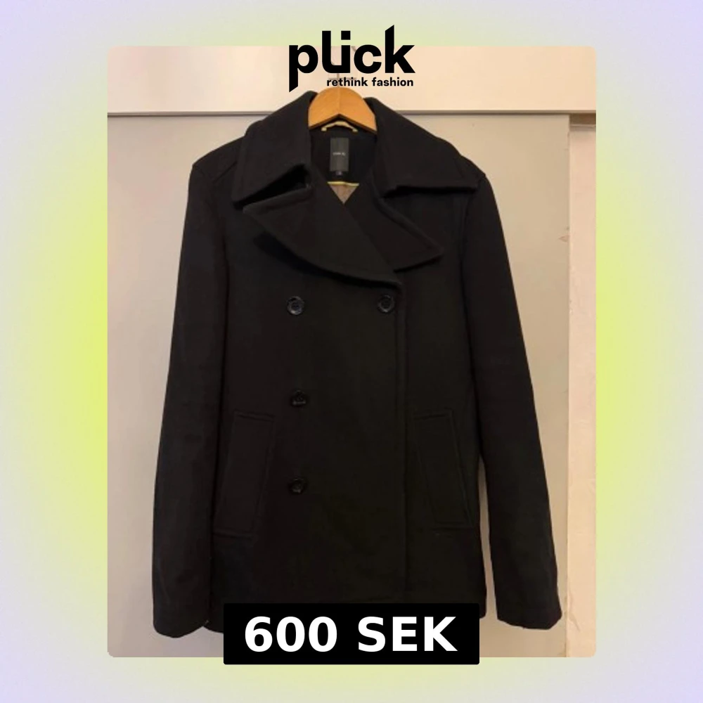Svart skepparkavaj från Emilio med bred krage och dubbelknäppning. Jackan har två snedställda fickor fram och är fodrad med beige tyg och gul kant. Materialet är 70% ull och 30% polyamid, väldigt varm. Stilren och klassisk look. Small men passar även medium.