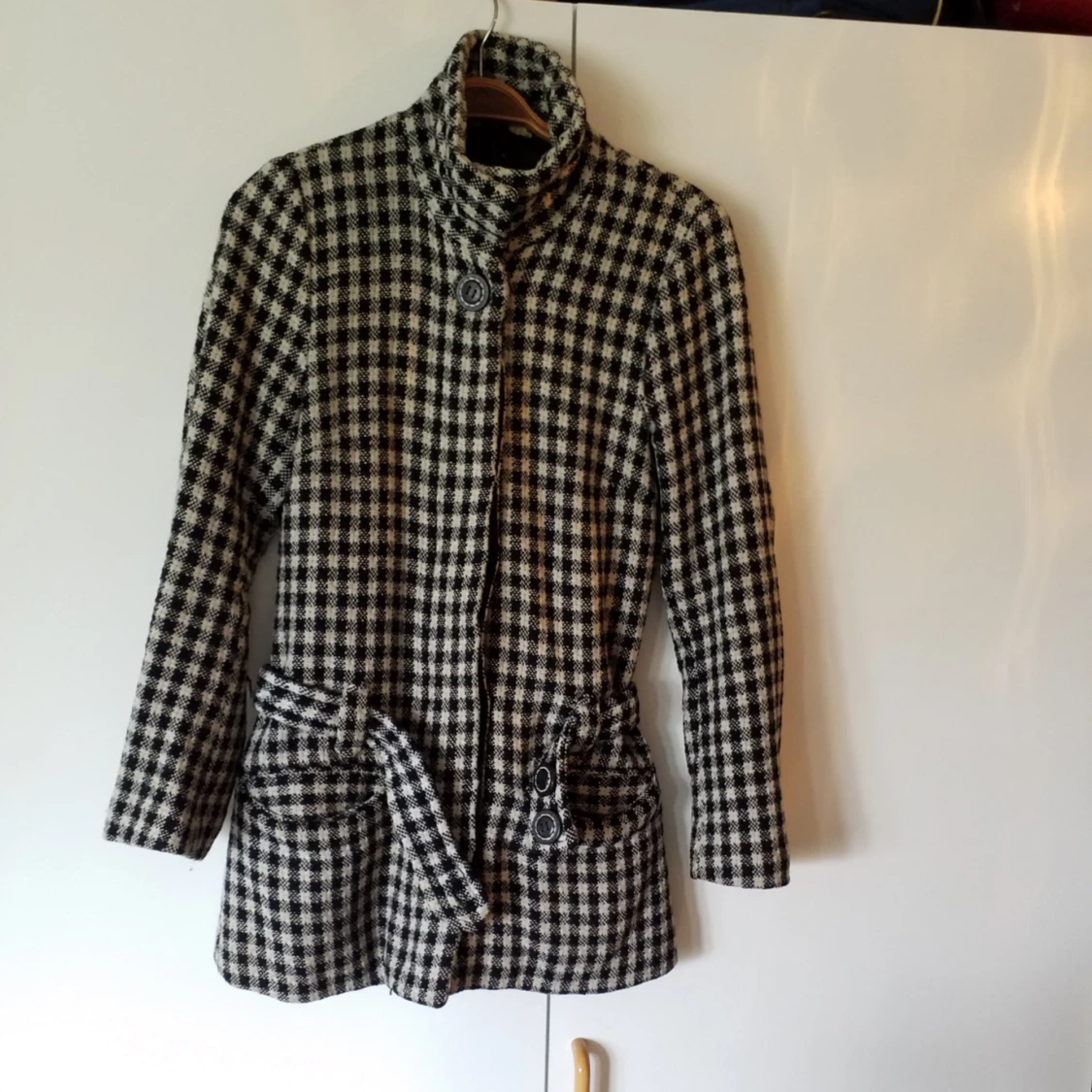 Varm jacka med hög krage och skärp
