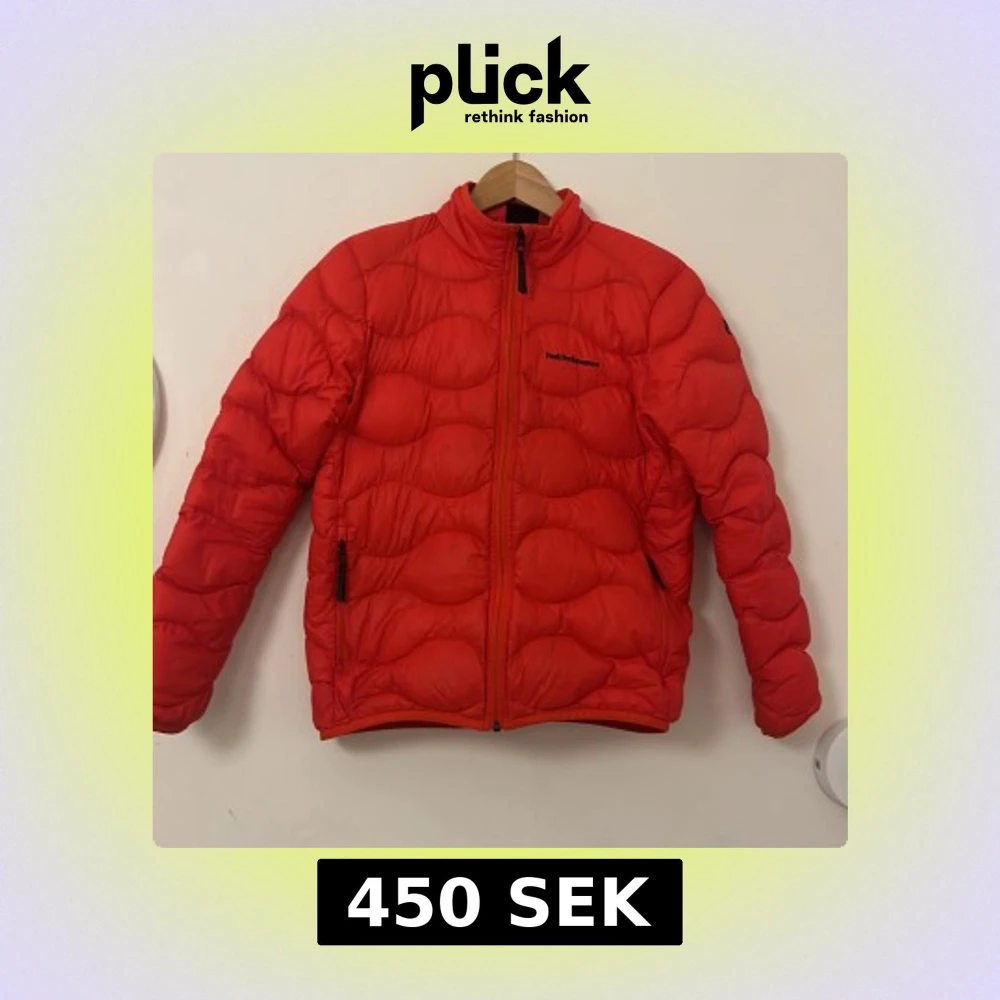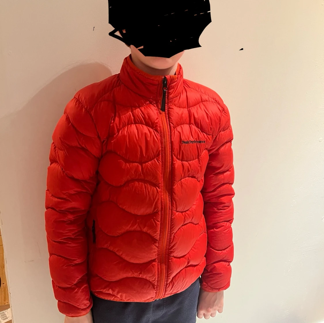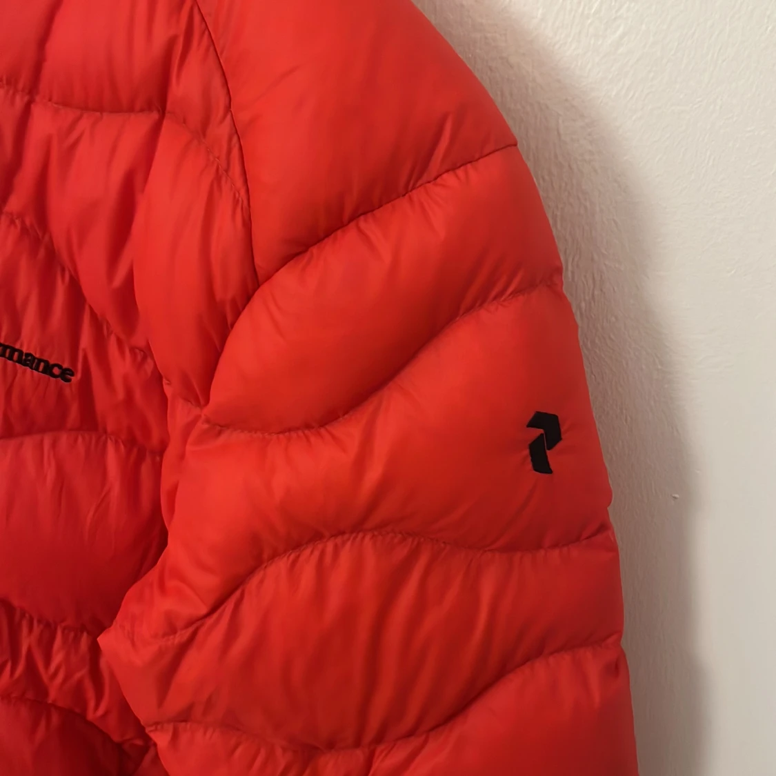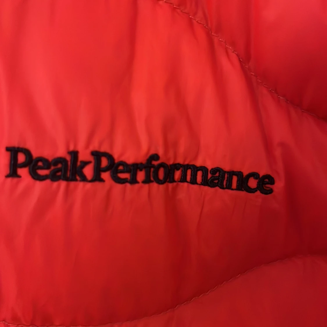 Säljer en snygg röd dunjacka från Peak Performance. Jackan har en quiltad design med dragkedja framtill och två praktiska fickor med dragkedjor. Perfekt för kyligare dagar och ger en sportigoch snygg look.