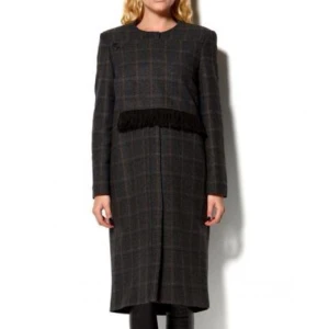 Rodebjer Connor Varm och stilig yllekappa i tweed från Rodebjer. Kappan har dold knäppning fram samt två fickor. Baktill finns ett långt sprund med dolda knappar och ett tygstycke med fransar går från baksidan och knäpps fram över livet