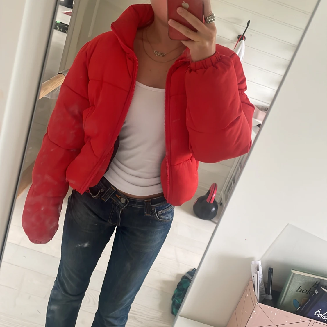 Skit snygg röd puff jacka från gina i bästa skick. Jacka med dragsko som man kan välja att den ska vara kort eller vara längre men jackan är i kortare modell. Storlek xs xxs