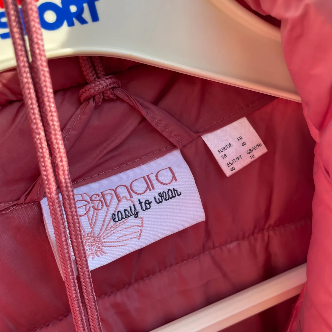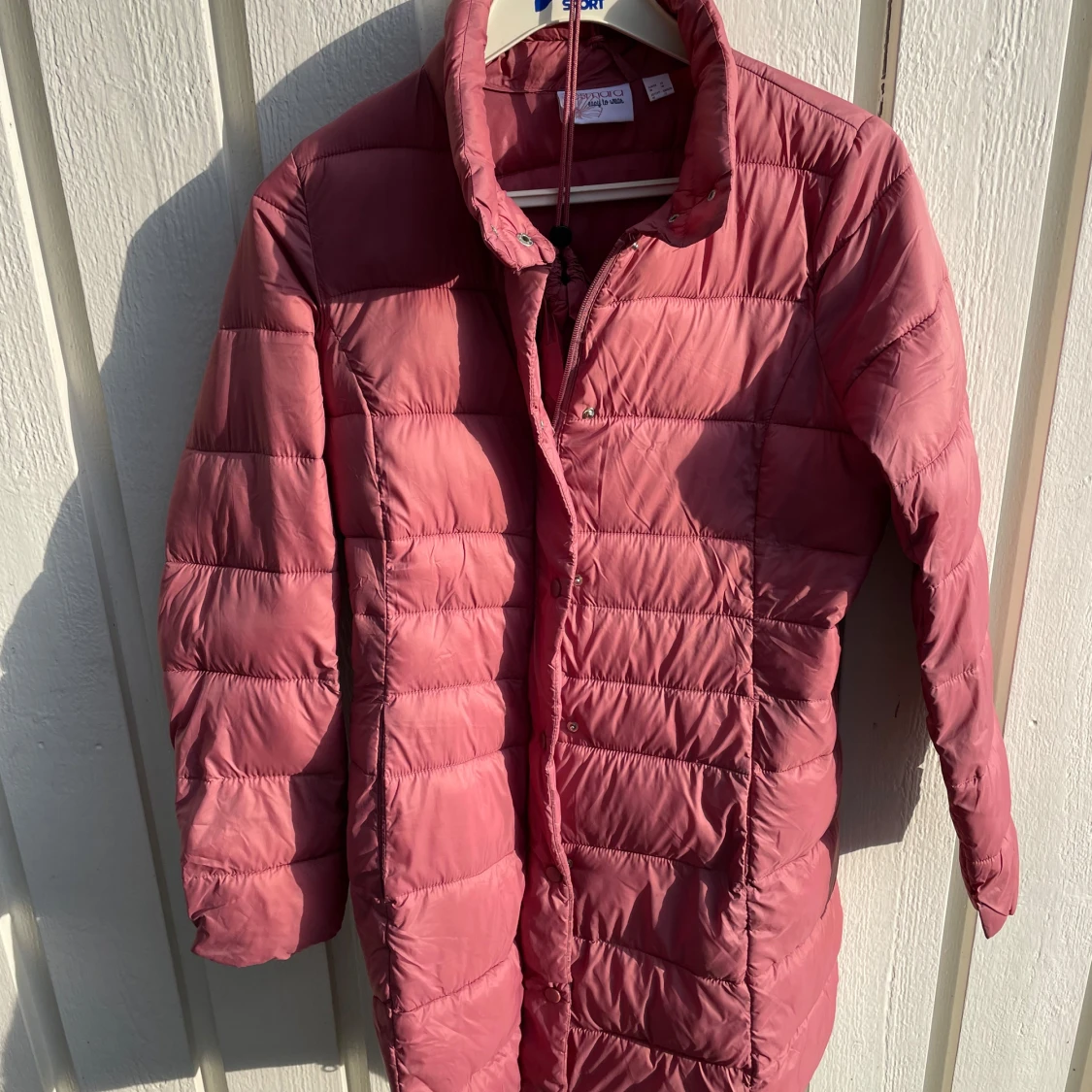 Säljer en lång, quiltad pufferjacka i snygg rosa färg från Esmara. Jackan har hög krage, långa ärmar och stängs med både dragkedja och knappar. Perfekt för kyliga dagar när du vill vara både varm och stilren.