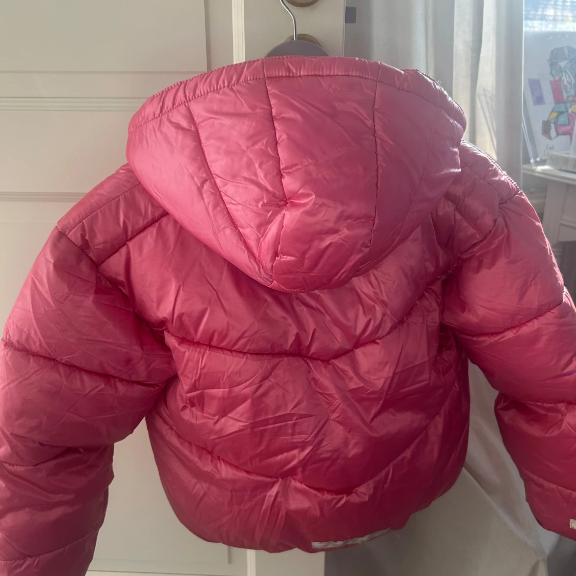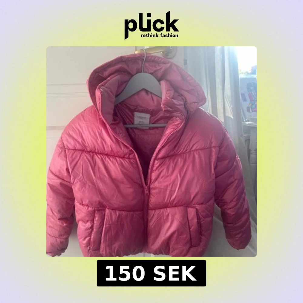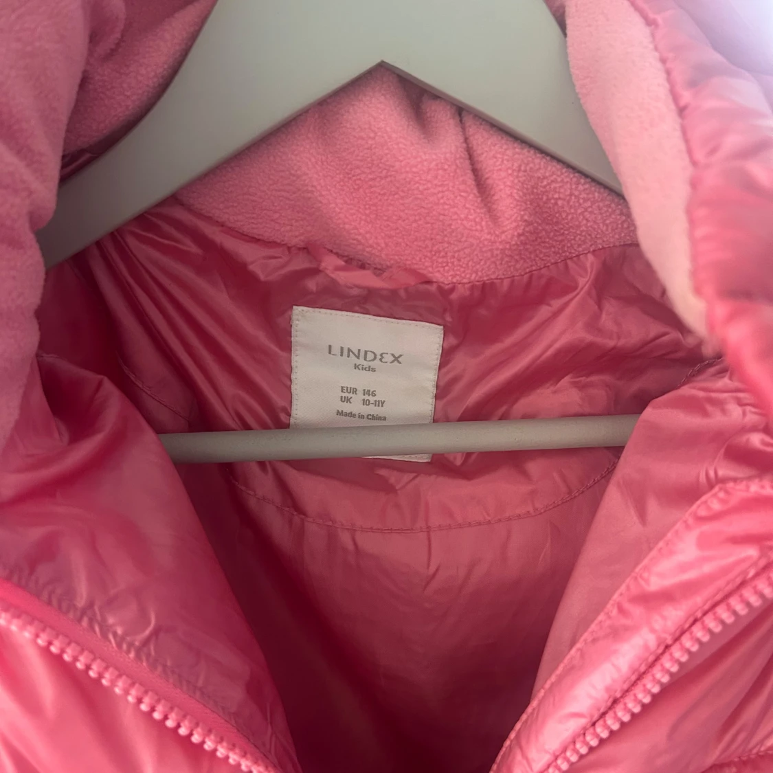 Rosa varm barn vinterjacka från Lindex med huva och dragkedja. Jackan har två stora fickor framtill och är fodrad med mjuk fleece på insidan av kragen.
