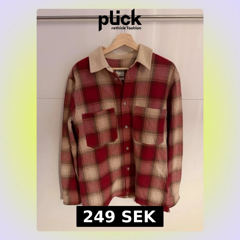 Säljer en röd och beige rutig overshirt från Zara med två stora bröstfickor och knappar framtill. Jackan har en ljus manchesterkrage som ger en cool kontrast. Perfekt för lager-på-lager och chill stil.
