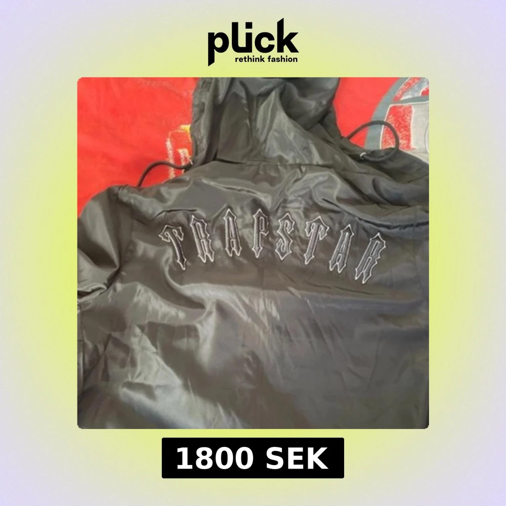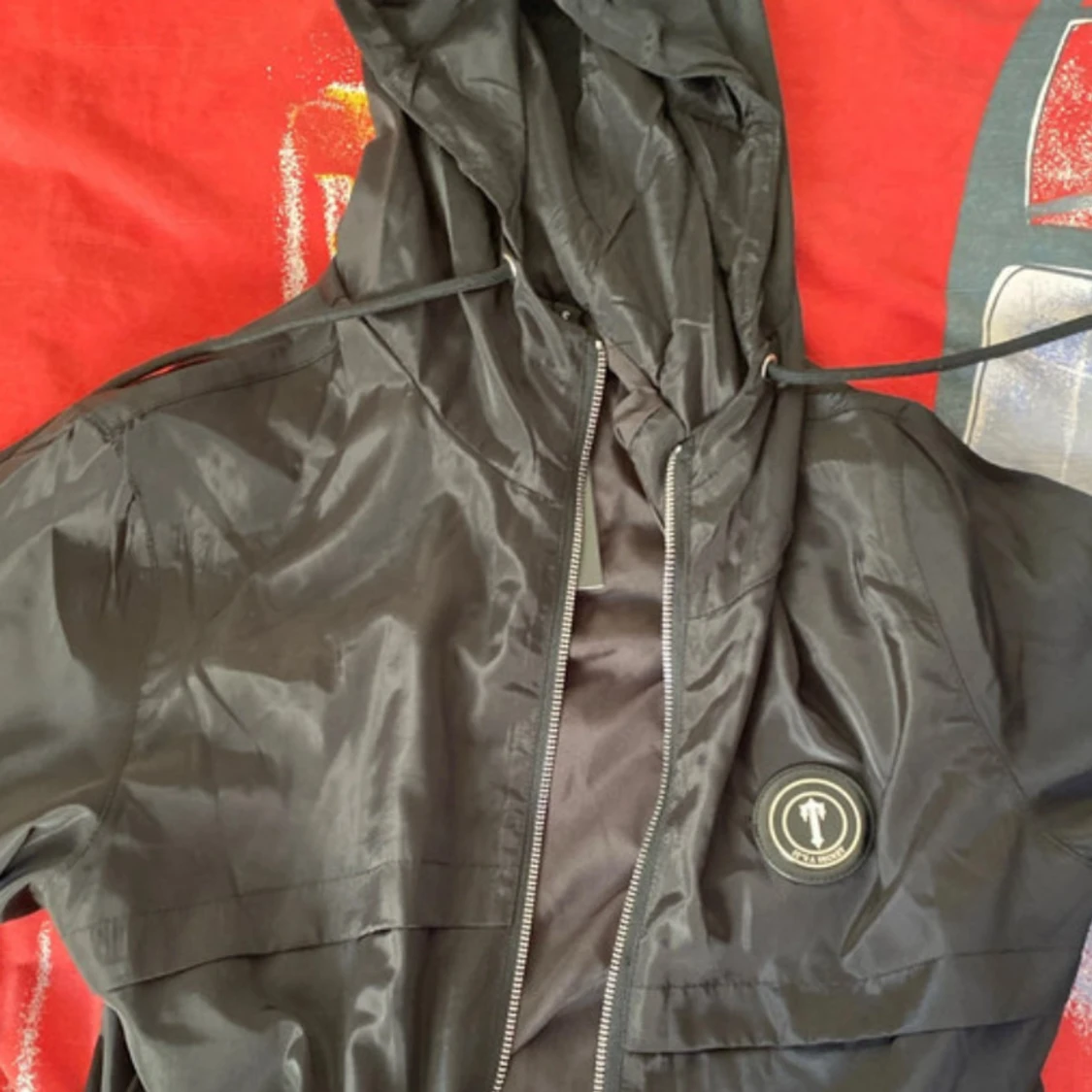 Snygg svart vindjacka från Trapstar med huva och dragkedja. Jackan har en cool broderad logga på ryggen och en rund emblem på bröstet. Perfekt för en streetwear-look.