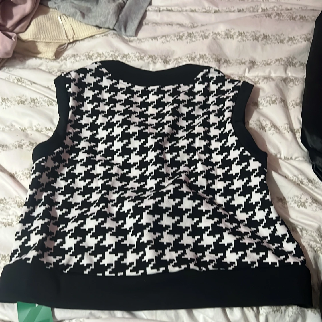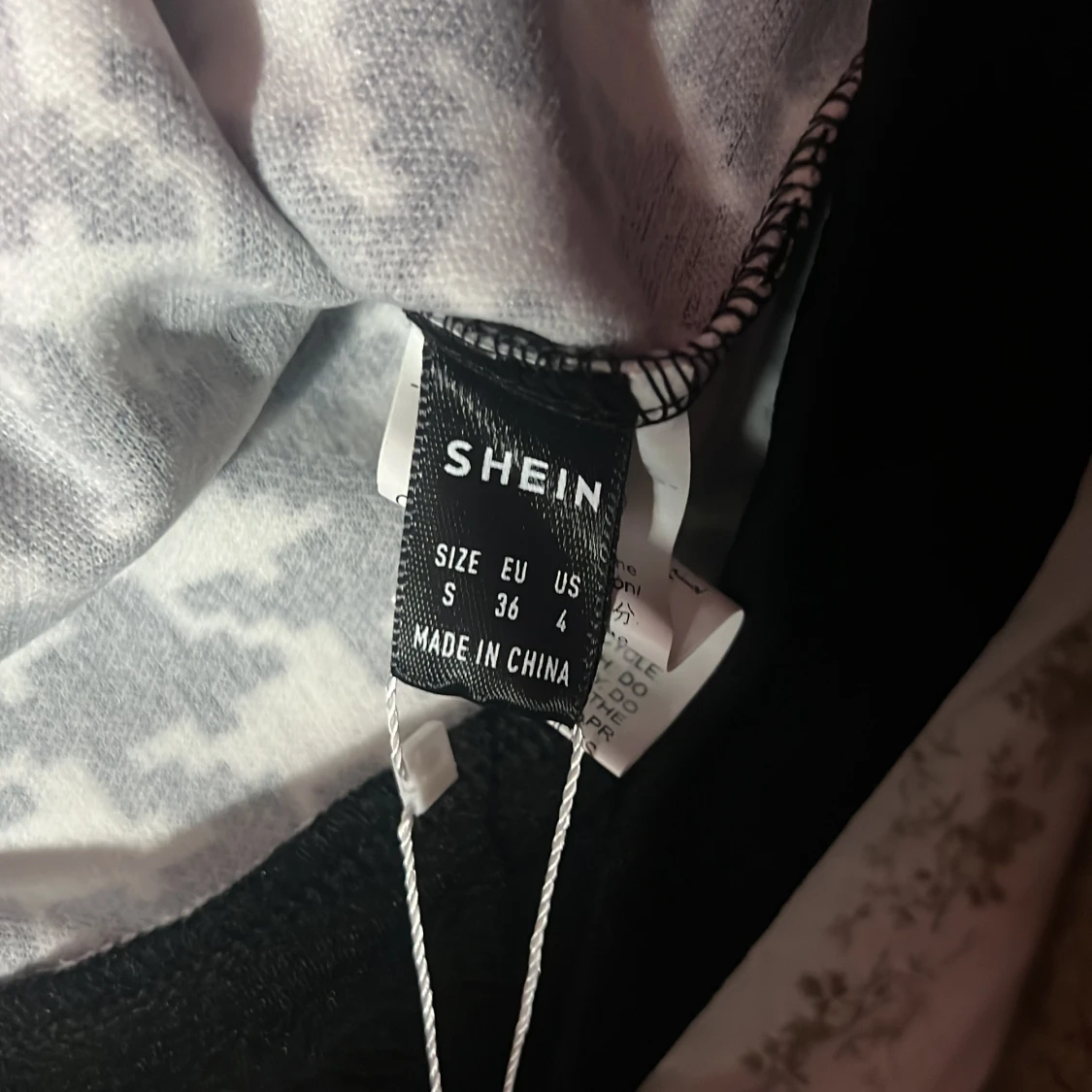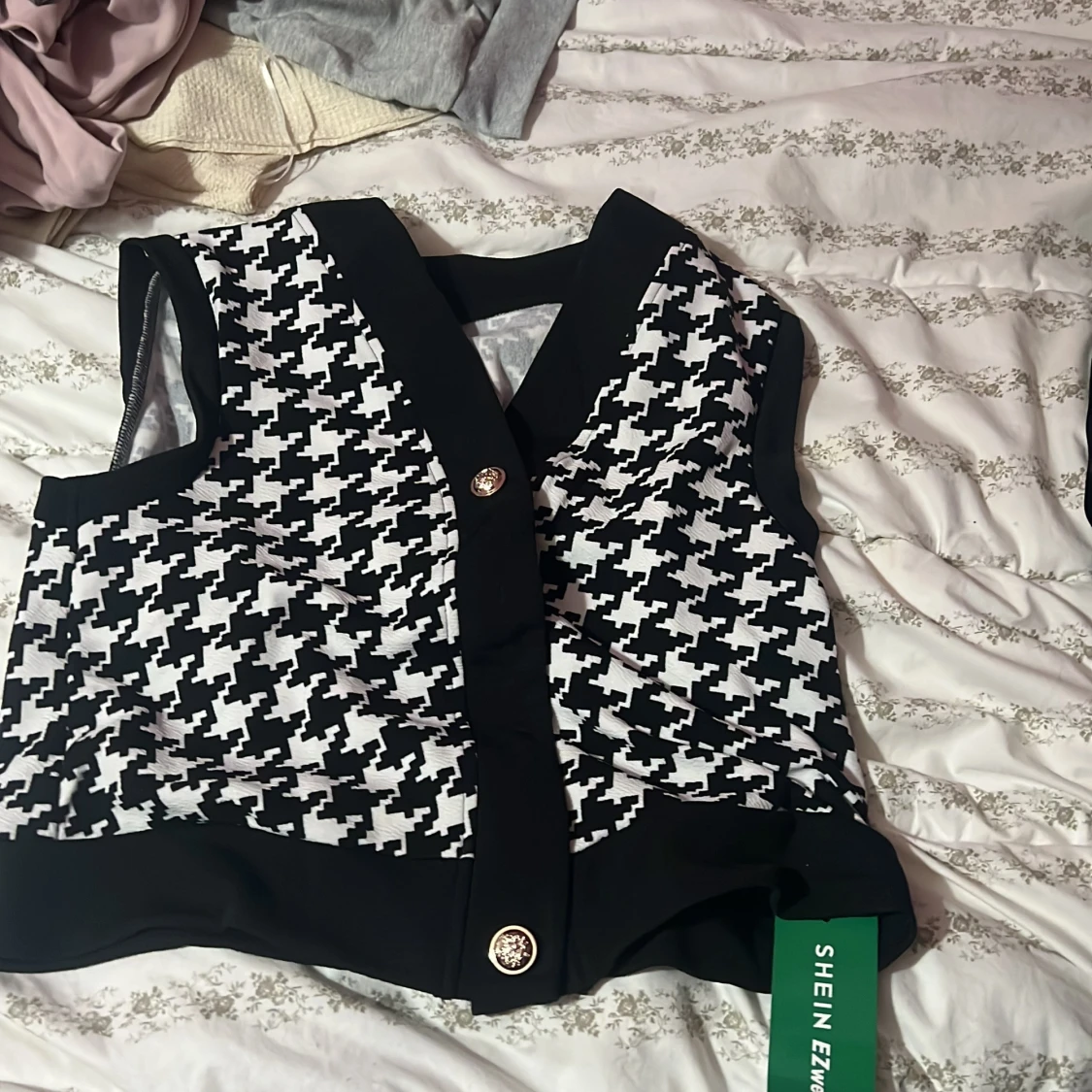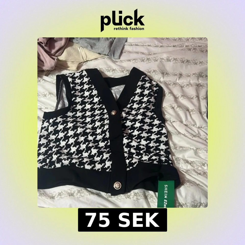 Snygg väst från SHEIN i svartvitt rutigt mönster med breda svarta kanter och dekorativa knappar framtill. Västen har en klassisk v-ringning och är tillverkad i ett mjukt syntetmaterial. Perfekt för att lyfta din outfit med en trendig touch.